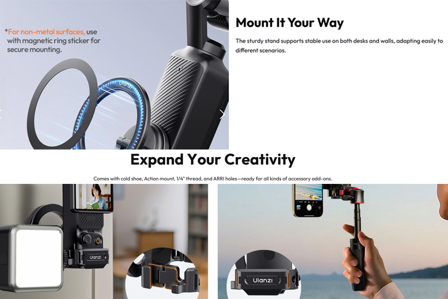ความหลากหลายในการใช้งาน: ใช้เป็นแท่นตั้งบนโต๊ะสำหรับการประชุมออนไลน์หรือการถ่ายเซลฟี่ ติดผนังหรือพื้นผิวโลหะเพื่อการถ่ายมุมพิเศษ เชื่อมต่อกับ Cold Shoe Mount สำหรับการติดตั้งอุปกรณ์แสง ใช้ร่วมกับขาตั้งกล้องผ่านช่อง 1/4″ และ ARRI Holes