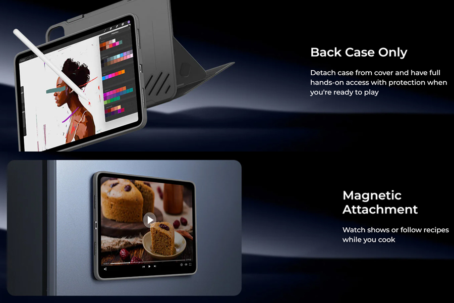 - ตัวเคสเป็นแม่เหล็ก สามารถดูดติดตู้เย็นได้ หรือเฟอร์นิเจอร์ที่เป็นโลหะ คุณจะทำอาหารไป ดูสูตรไปก็สบาย
