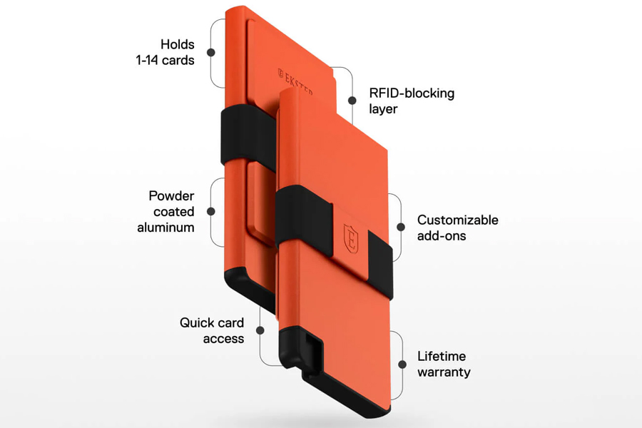 กระเป๋าสตางค์อัจฉริยะที่บางที่สุดในโลก ทำจากโลหะทั้งใบ โดยไม่มีพลาสติกให้เห็นเลย ผลิตจากโลหะรีไซเคิล 100% เป็นกล่องเก็บบัตรได้รับการออกแบบมาให้จัดเก็บได้และเข้าถึงบัตรได้รวดเร็วเพียงแค่กดปุ่ม ปรับแต่งได้ด้วยอุปกรณ์เสริมแบบแยกส่วนที่จะช่วยขยายพื้นที่จัดเก็บและฟังก์ชันการใช้งาน ใส่บัตรและธนบัตรได้ตั้งแต่ 1-14 ใบ