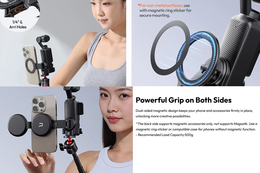 ระบบแม่เหล็กคู่ที่แข็งแรง: แม่เหล็ก N52 คุณภาพสูงยึดจับได้แน่นหนาและปลอดภัย รองรับน้ำหนักได้ถึง 500 กรัม เหมาะกับ DJI Pocket 3 และอุปกรณ์เสริม ติดกับสมาร์ทโฟน MagSafe ได้โดยตรงโดยไม่ต้องใช้อุปกรณ์เสริม สำหรับโทรศัพท์ที่ไม่มี MagSafe สามารถใช้ร่วมกับแหวนแม่เหล็กเสริม