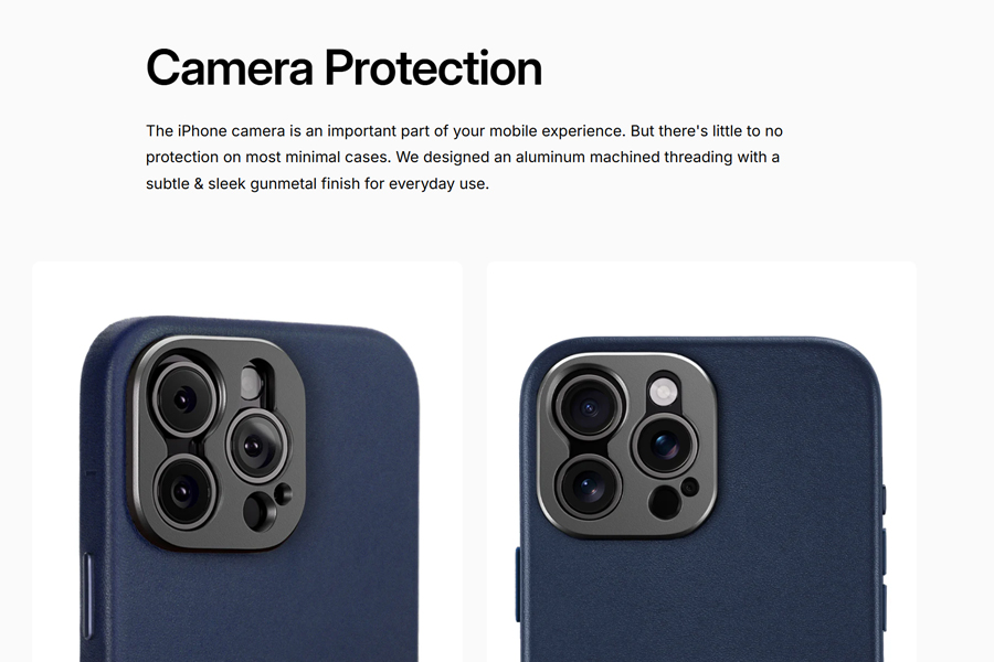 เคสดีไซน์ Minimal จาก Sandmarc ที่มีความเรียบหรูและดูดีของหนังส่วนที่ดีที่สุด Premium Full Grain Leather ที่มีความนุ่มมือและสัมผัสดี และการจับถือที่มั่นคง โดดเด่นด้วยการมีกันเลนส์วัสดุ Aluminum แบบเต็มเลนส์กันถึงฐานเลนส์และยังเป็นฟังก์ชั่นเสริมที่มีเกลียวด้านในเพื่อประกอบเข้ากับชุดเลนส์ของ Sandmarc และตัวเคสรองรับ MagSafe พร้อมฟังก์ชั่นการใช้งานการชาร์จแบบไร้สายอีกด้วย (Wireless Charging Compatible)
