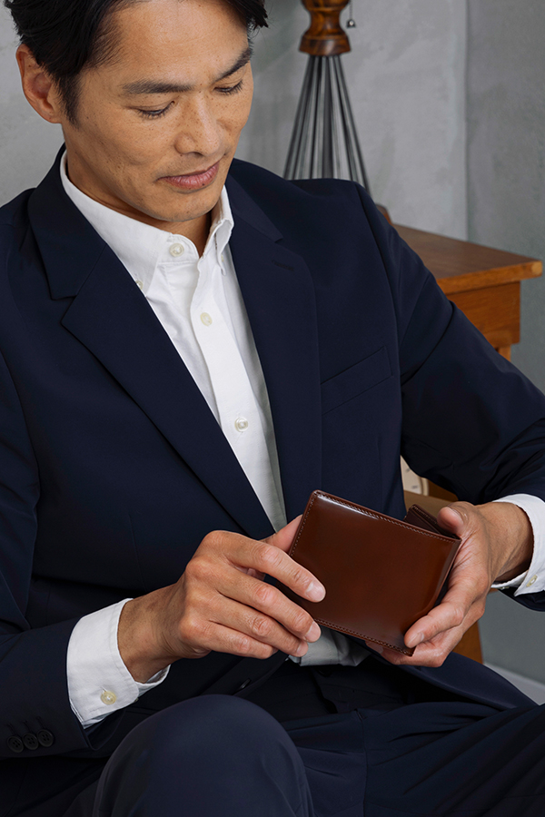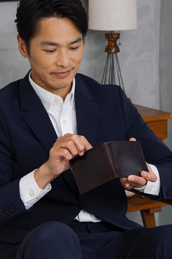 หนังคอร์โดแวน เป็นหนังที่ได้จากชั้นใต้ผิวหนังของสะโพกม้า มีคุณสมบัติที่แตกต่างกันสองประการคือ เนื้อสัมผัสเรียบเนียนและความแข็งแรงทนทานเป็นพิเศษ หนังคอร์โดแวนที่ใช้สำหรับกระเป๋าสตางค์นี้มาจากโรงฟอกหนังเก่าแก่ของญี่ปุ่น Miyauchi Sangyo เท่านั้น ซึ่งผ่านกระบวนการฟอกหนังอย่างพิถีพิถันโดยใช้สารแทนนินจากพืช