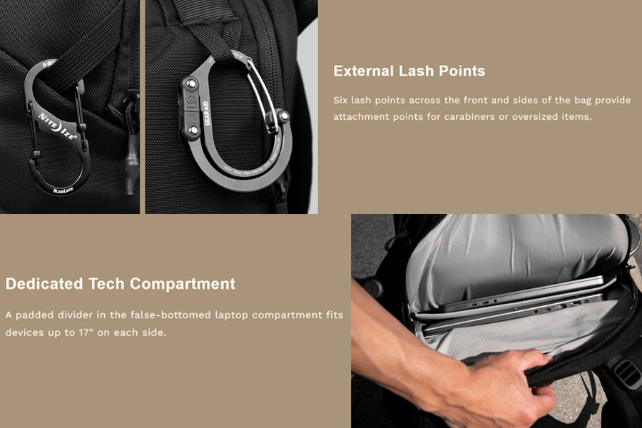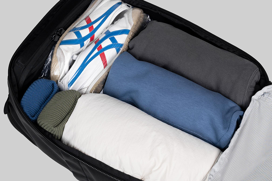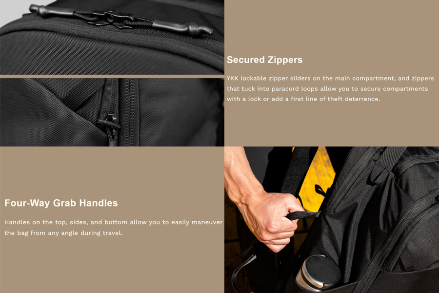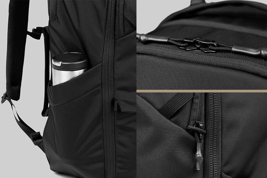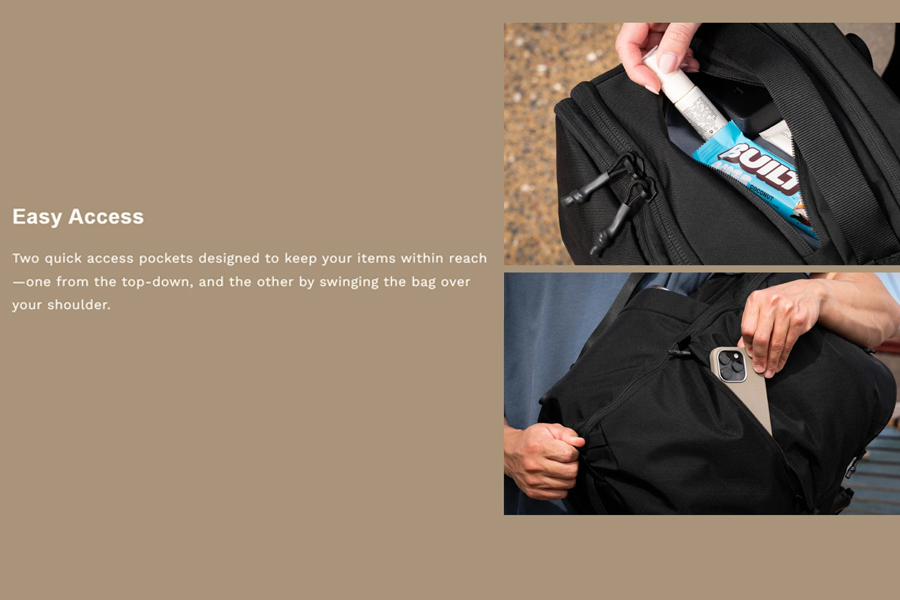 - วัสดุ : Exterior: 840D 100% Nylon // Lining: 150D PFAS-free PU Coated Ripstop Nylon Lining // Hardware:#10 & #8 YKK RC Zippers with DWR (Durable Water Repellent) Finish #5 YKK RC Zippers // Woojin Buckles // WETOOL Aluminum Key Clip