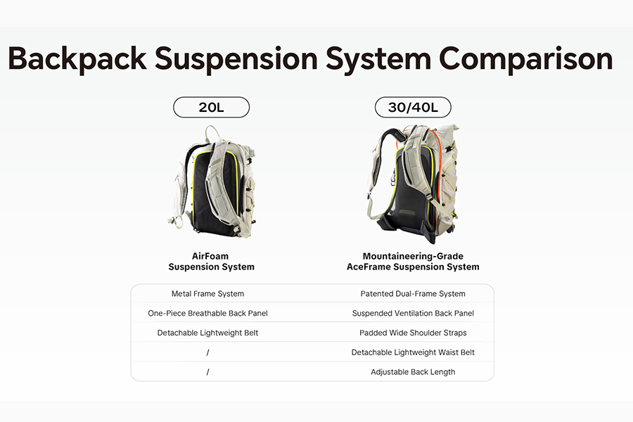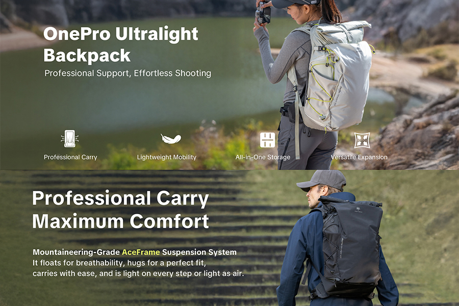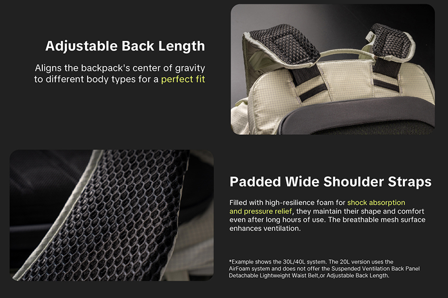 PGYTECH - OnePro Ultralight Backpack มาพร้อมสะพายระดับมืออาชีพ AirFoam Suspension System เสริมโครงโลหะภายใน ช่วยกระจายน้ำ หนักไปทั่วแผ่นหลังได้อย่างมีประสิทธิภาพ ลดแรงกดทับ ระหว่างการใช้งานเป็นเวลานาน แผ่นหลังแบบ Mesh ระบายอากาศได้ดี เพิ่มความโปร่งสบายตลอดการเดินทาง สายสะพายไหล่แบบกว้าง บุฟองน้ำหนานุ่ม พร้อมสายรัดหน้าอกที่สามารถปรับได้ ช่วยลดแรงกดบนหัวไหล่อย่างเห็นได้ชัด อีกทั้งสายสะพายยังมีช่องเก็บโทรศัพท์หรืออุปกรณ์ชิ้นเล็ก เพิ่มความสะดวกในการใช้งาน