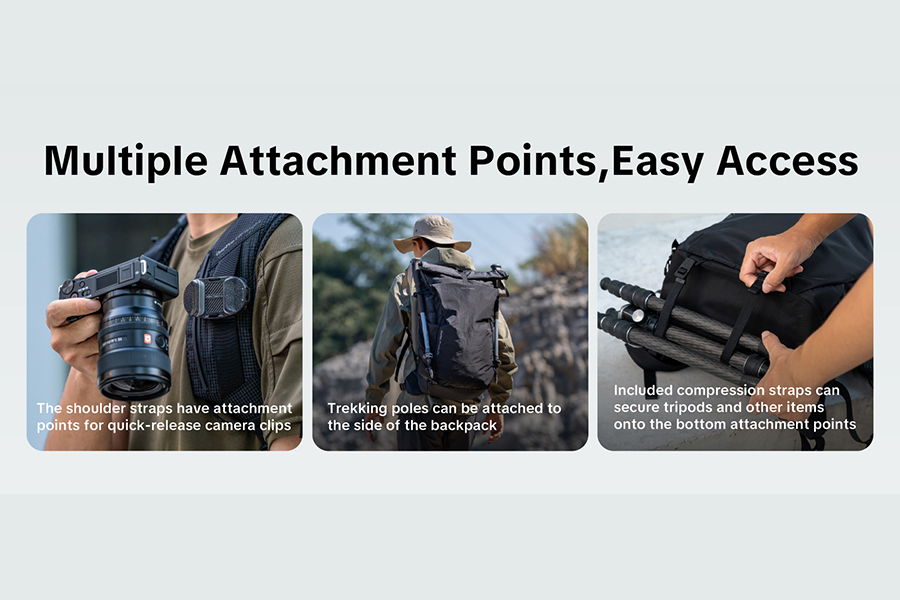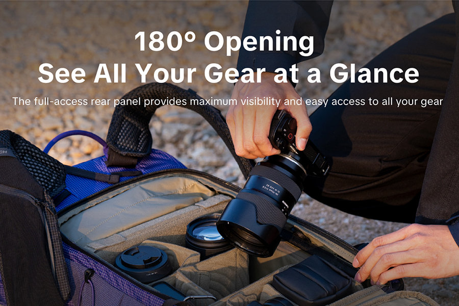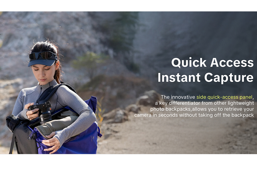 ตัวกระเป๋าผลิตจากผ้า Nylon Blend ความแข็งแรงสูง ผสานโครงสร้างแผ่นหลังแบบแขวน (Suspended Back Panel) ช่วยลดน้ำหนักส่วนเกินให้เบาที่สุด โดยยังคงความแข็งแรงและรองรับน้ำหนักได้อย่างมั่นใจ หนึ่งในจุดเด่นสำคัญคือ ช่องหยิบกล้องด้านข้างแบบ Quick Access ที่ช่วยให้สามารถหยิบกล้อง ได้อย่างรวดเร็วโดยไม่ต้องถอดกระเป๋า แตกต่างจากกระเป๋ากล้องน้ำหนักเบาทั่วไป