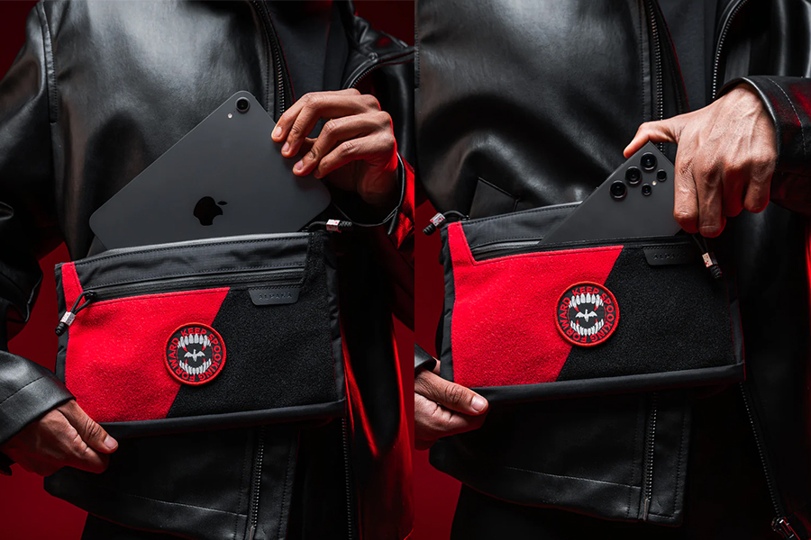 - วัสดุ : Axoflux 210D ripstop nylon in Black, with 100% non-woven nylon in Black and Red (front patch panel)