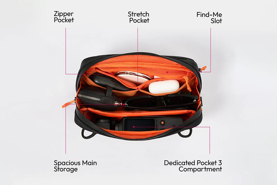 ระบบจัดเก็บแบบชั้นอัจฉริยะ: ช่องหลักขนาดใหญ่ รองรับสมาร์ทโฟน แท็บเล็ต และอุปกรณ์อิเล็กทรอนิกส์ ช่องเฉพาะสำหรับ DJI Pocket 3 พร้อมที่วางอุปกรณ์เสริม ช่องซิปด้านหน้า สำหรับใส่ของใช้จำเป็น หยิบง่าย ช่อง Find-Me Slot ที่ช่วยจัดเก็บอุปกรณ์เล็กๆ ไม่ให้หาย
