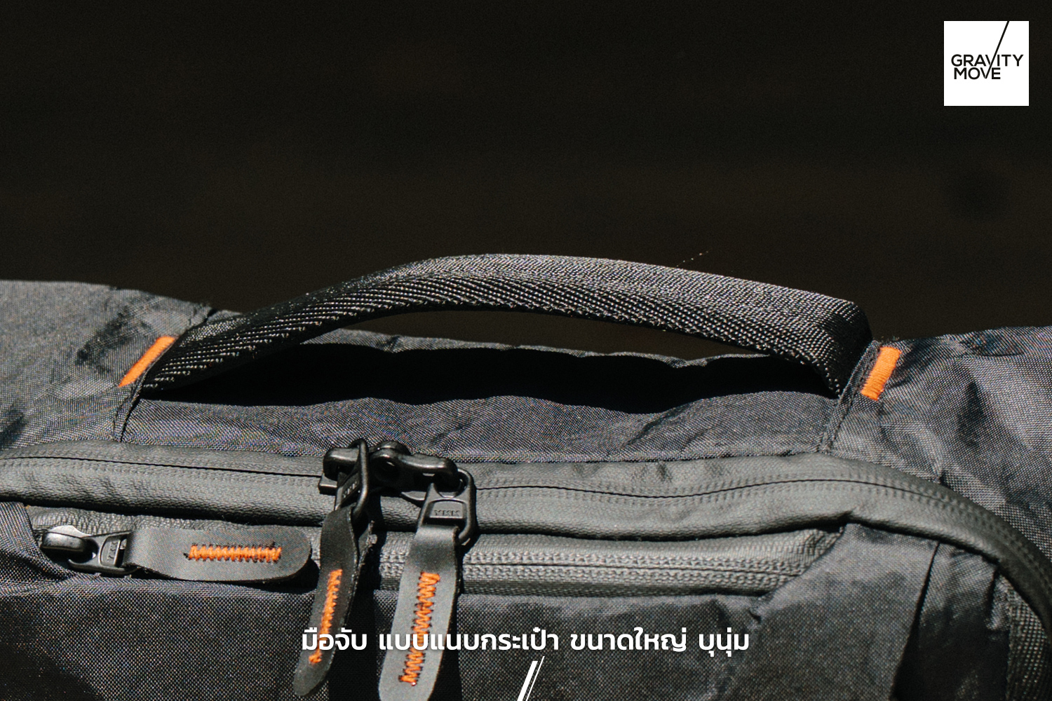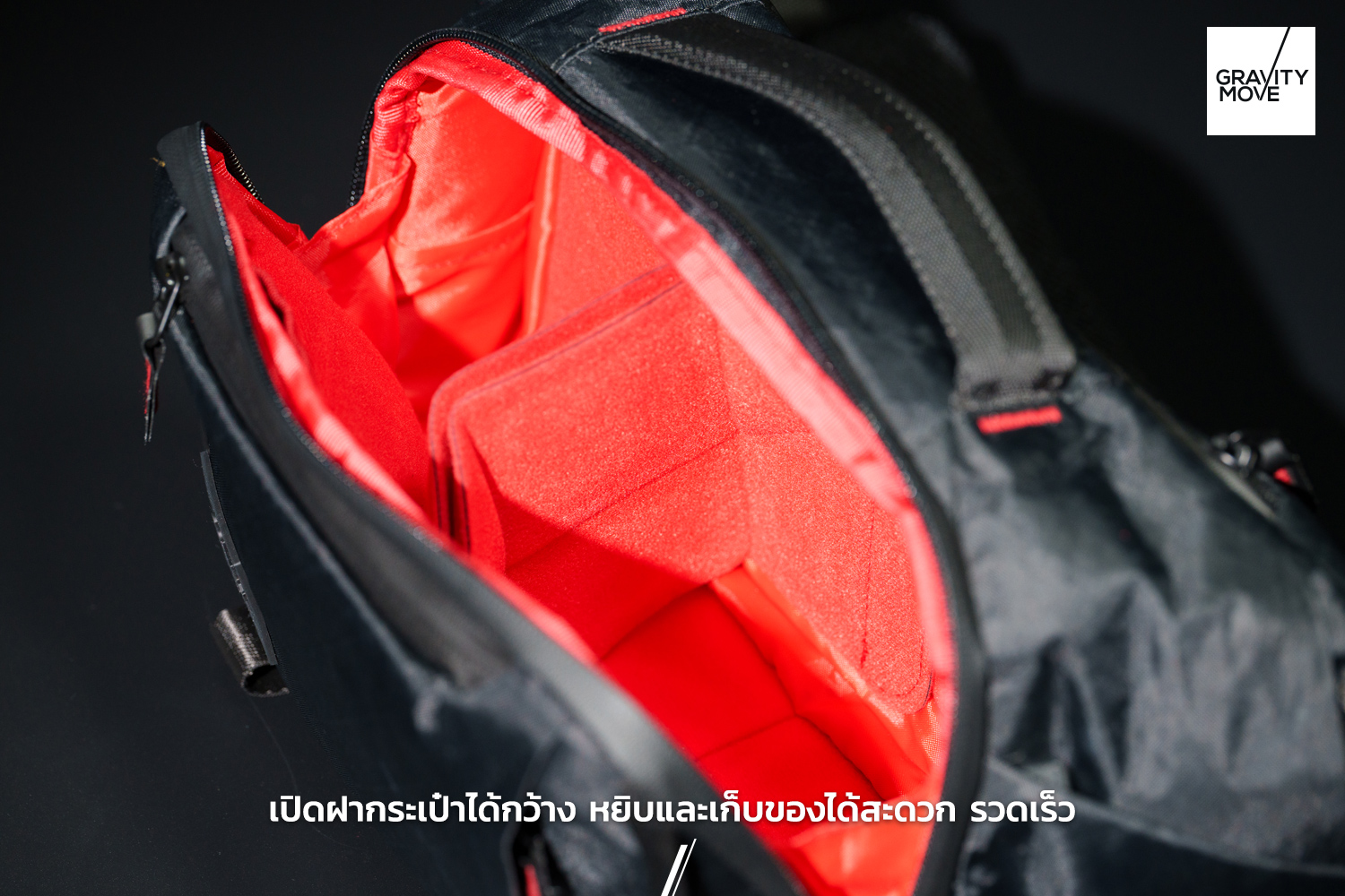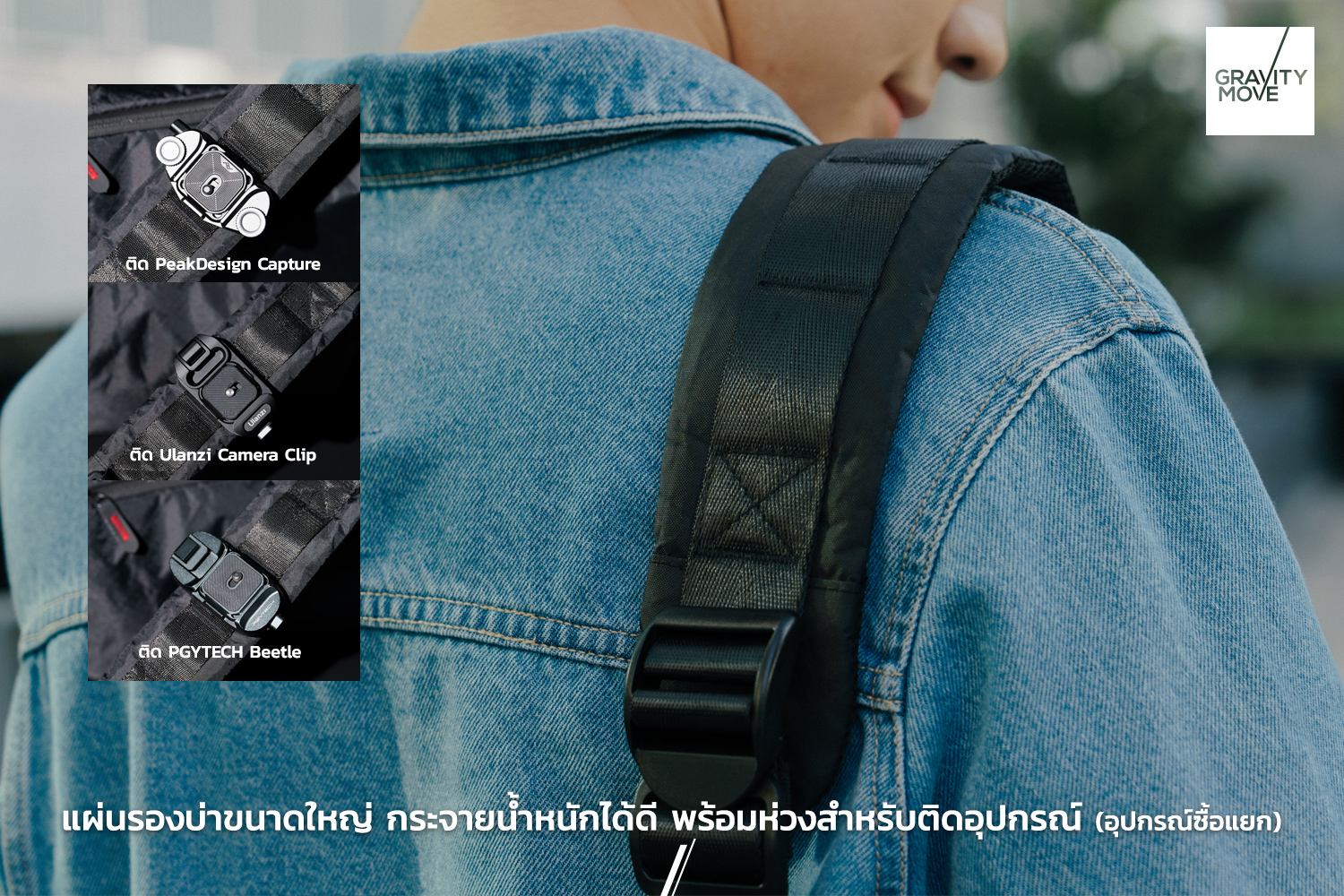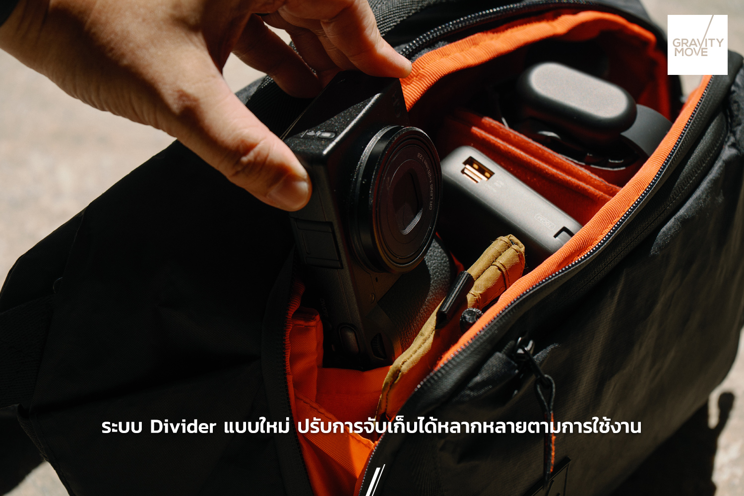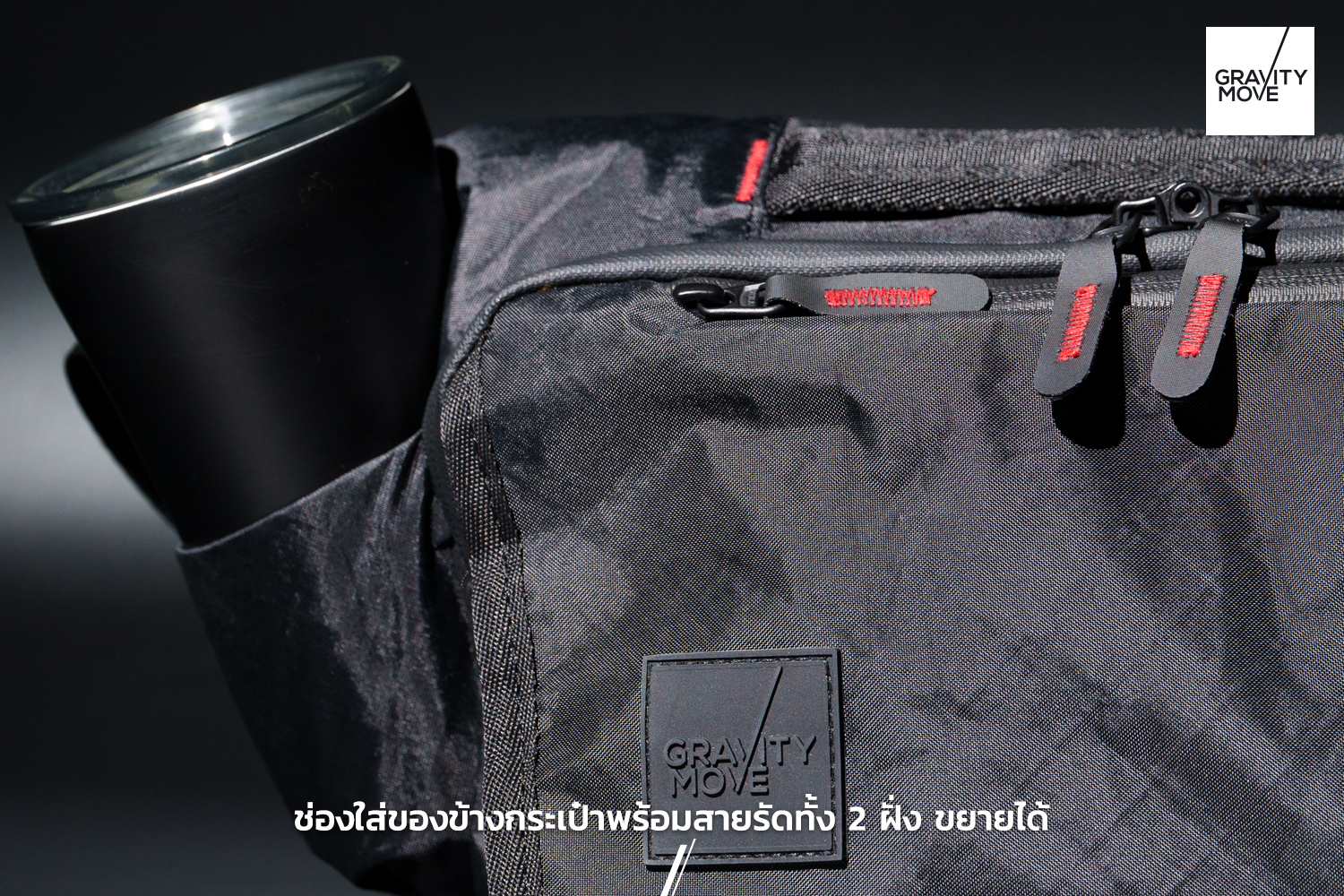 ในด้านรูปลักษณ์ ถูกปรับให้เรียบคลีนขึ้นมากๆ เพื่อให้เหมาะกับการใช้งานที่หลากหลายยิ่งขึ้น แต่ก็ยังคง DNA ของแบรนด์ด้วยเส้นเฉียงที่ด้านหน้า ในด้านของวัสดุ นี่คือครั้งแรก ที่ Gravity Move ใช้ผ้าภายนอกจาก ECOPAK แบรนด์ผ้าอเมริกาที่มาแรงสุดๆ ในปัจจุบัน ผ้าที่เลือกมาคือ ECOPAK EPLX200 Black Knight ผ้า Laminated 3 layers กันน้ำ น้ำหนักเบา ผิวสัมผัสพรีเมี่ยม พร้อมฟังก์ชั่นเด็ดๆ Buckle Strap คือ Fidlock V buckle จากเยอรมัน เป็น Buckle ที่โด่งดังและสร้างมาตรฐานใหม่ให้กับวงการ buckle ในปัจจุบัน ด้านในกระเป๋าออกแบบให้สามารถปรับช่องใส่ได้หลากหลาย ตามอุปกรณ์ที่พกพา จะใช้กล้อง หรือไม่ใช้กล้อง คุณสามารถจัดได้อย่างสมบูรณ์ที่สุด ฝากระเป๋ามาพร้อมระบบปิดชั่วคราวด้วยแม่เหล็ก ช่วยให้คุณสามารถปิดกระเป๋าชั่วคราวได้อย่างรวดเร็ว ขนาดเล็กลง แต่ยังจุได้ถึง 5 ลิตร พร้อมขยายเป็น 6 ลิตรได้ ช่อง Quick Access ด้านหน้า ขนาดใหญ่ เก็บมือถือสะดวก ซิป YKK Aquaguard กันน้ำ พร้อม Hook ล็อค กันคนแอบเปิด ช่องซิปด้านหลังแนบตัว กันขโมย ช่องเก็บของ 19 ช่อง สายสะพายพร้อม Pad บุนุ่ม ยาวพิเศษ รองรับทุกองศาการสะพาย ปรับสายให้สั้น เพื่อใช้คาดเอวได้ มีสายรัดอเนกประสงค์ด้านล่าง มือจับบุนุ่ม แบบ Low Profile น้ำหนักเบาเพียง 600 กรัม