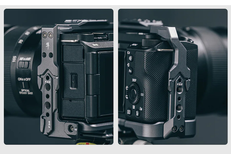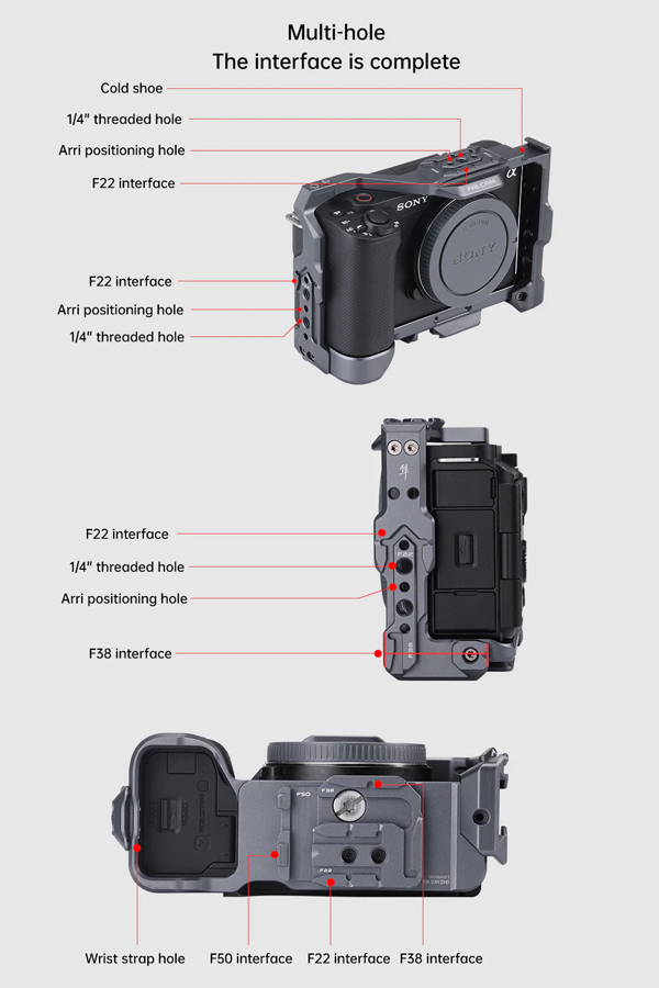 อินเทอร์เฟซครบครันและขยายได้: Cold Shoe Mount บนด้านบนสำหรับติดไฟ LED, ไมโครโฟน F22 Interface สำหรับอุปกรณ์ขนาดเล็ก F38 Interface บนด้านข้างและฐาน F50 Interface ที่ฐานสำหรับอุปกรณ์ขนาดใหญ่ รูเกลียว 1/4″ Threaded Hole มาตรฐานสากล Arri Positioning Hole สำหรับงานมืออาชีพ Wrist Strap Hole สำหรับคล้องสายข้อมือเพิ่มความปลอดภัย