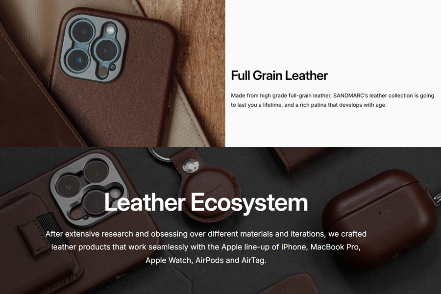 เคสดีไซน์ Minimal จาก Sandmarc ที่มีความเรียบหรูและดูดีของหนังส่วนที่ดีที่สุด Premium Full Grain Leather ที่มีความนุ่มมือและสัมผัสดี และการจับถือที่มั่นคง โดดเด่นด้วยการมีกันเลนส์วัสดุ Aluminum แบบเต็มเลนส์กันถึงฐานเลนส์และยังเป็นฟังก์ชั่นเสริมที่มีเกลียวด้านในเพื่อประกอบเข้ากับชุดเลนส์ของ Sandmarc และตัวเคสรองรับ MagSafe พร้อมฟังก์ชั่นการใช้งานการชาร์จแบบไร้สายอีกด้วย (Wireless Charging Compatible)