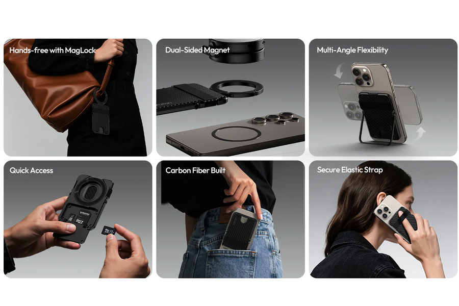 จัดเก็บอัจฉริยะ เข้าถึงง่าย: เก็บบัตรได้สูงสุด 4 ใบ พร้อมระบบกดออกแบบ Push-to-Access แผงคาร์บอนไฟเบอร์กันบัตรงอ แข็งแรงทนทาน สายรัดยางยืดล็อคบัตรให้ปลอดภัย ช่องเก็บ SIM Pin, SD Card และ TF Card ในตัว