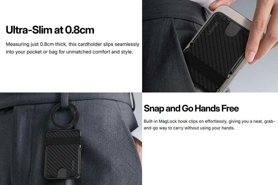 บางเบาสุดขีด พกพาสะดวก: หนาเพียง 0.8 เซนติเมตร บางกว่าบัตรเครดิต 4 ใบซ้อนกัน น้ำหนักเบาเพียง 100 กรัม ใส่กระเป๋ากางเกงได้สบาย ดีไซน์สไตล์มินิมอลสีดำด้าน ดูพรีเมียมทันสมัย วัสดุคาร์บอนไฟเบอร์แท้ทนทานต่อรอยขีดข่วน