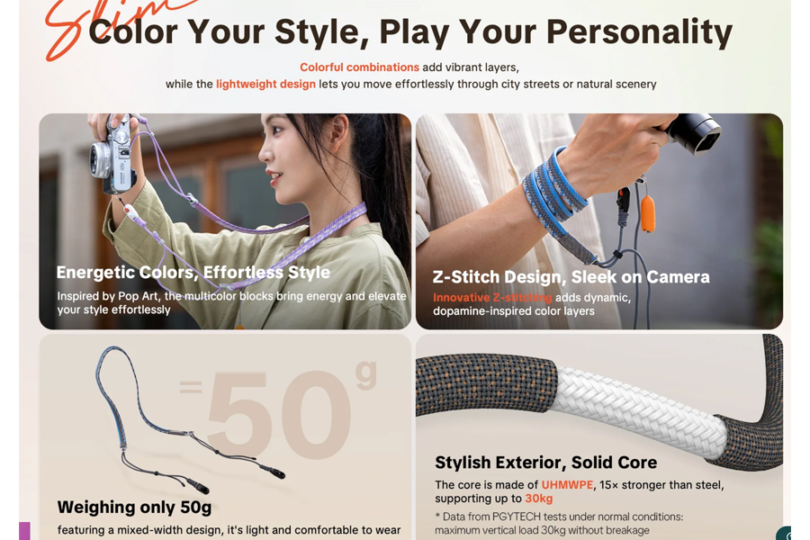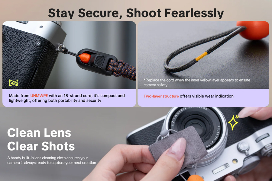 สายคล้องกล้องดีไซน์บางเบา แต่แข็งแกร่งด้วยแกนกลางที่ทำจากวัสดุ UHMWPE ซึ่งแข็งแรงกว่าเหล็กถึง 15 เท่า ทำให้คุณสามารถใช้งานกับกล้อง Mirrorless หรือ DSLR พร้อมเลนส์ได้อย่างมั่นใจ เป็นสายที่ออกแบบมาให้ใช้งานได้ทั้งวันโดยไม่รู้สึกเมื่อยล่า