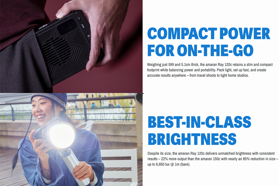 - เอาต์พุตที่ดีที่สุดในระดับเดียวกัน: สูงสุด 6,850 ลักซ์ @ 1 เมตร 22%+ สว่างกว่า amaran 150C ลดขนาดลงเกือบ 85%