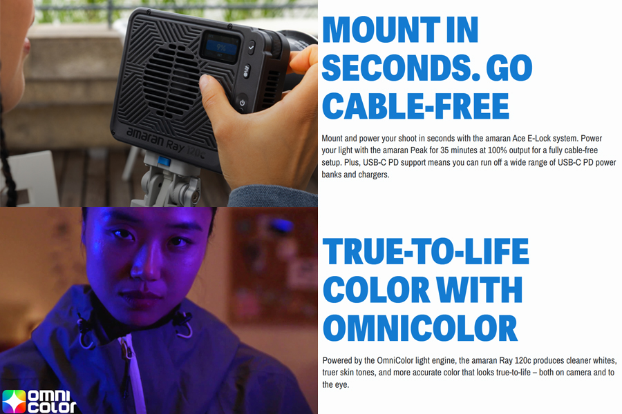 - มาพร้อม Ace E-Lock: การทํางานแบบไม่ต้องใช้สายเคเบิล สำหรับใช้งานร่วมกับ amaran Peak