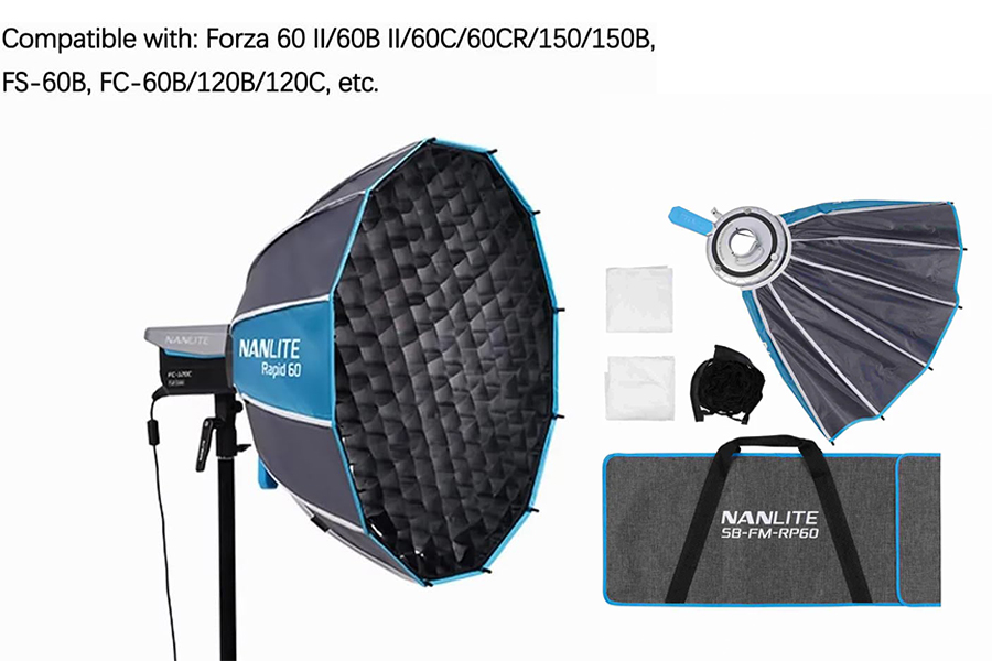 - ใช้งานร่วมกับเมาท์ Bowens และ FM ได้ : มีเมาท์ FM สำหรับใช้งานร่วมกับไฟสปอตไลท์ LED ขนาดกะทัดรัด Nanlite Forza, FS และ FC series และยังมีสปีดริงสำหรับเมาท์ Bowens ให้ด้วย