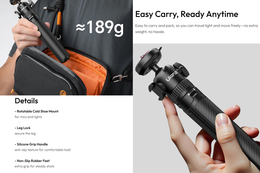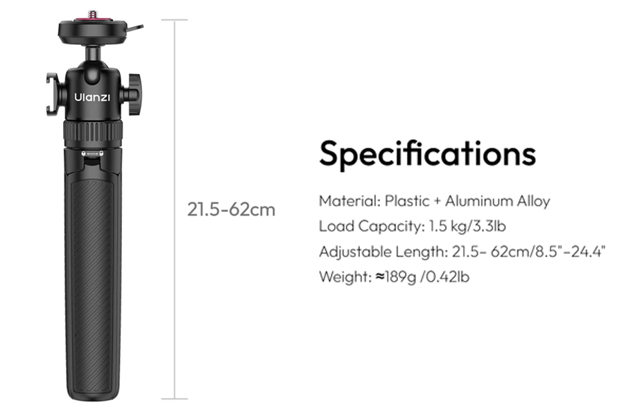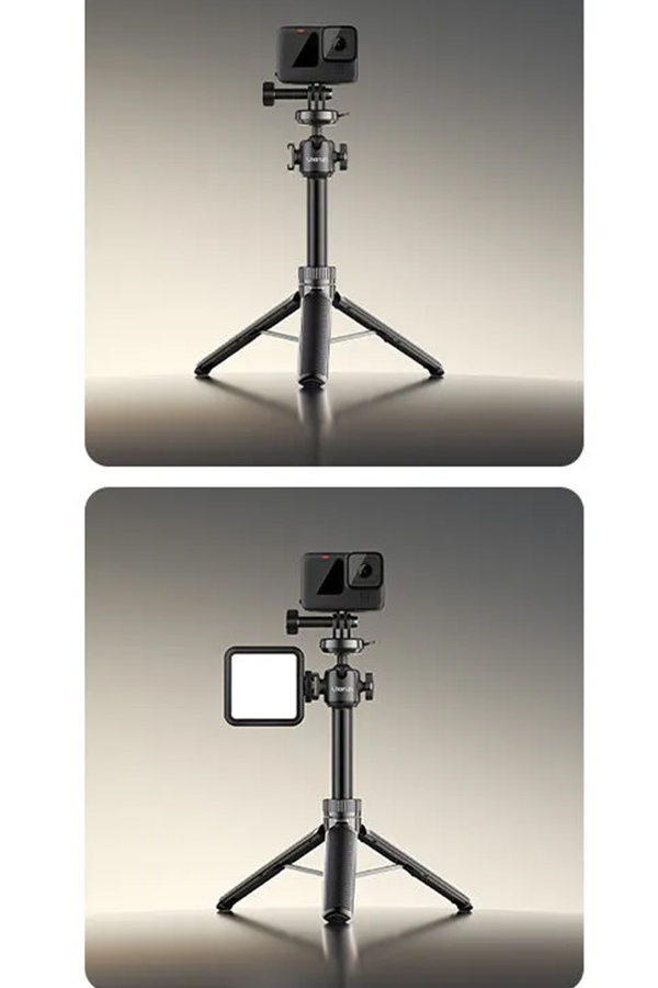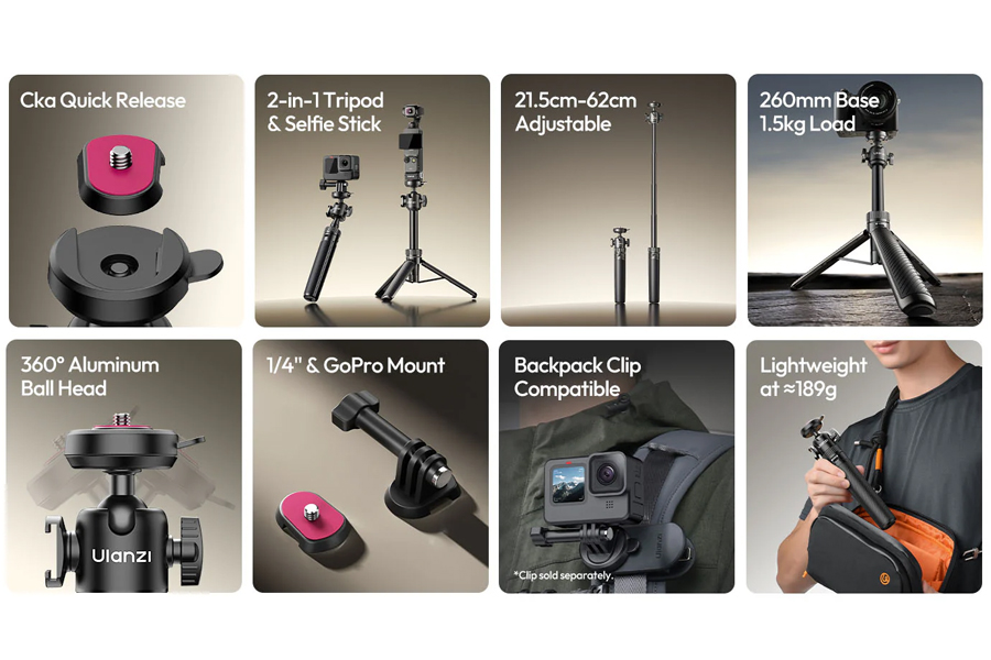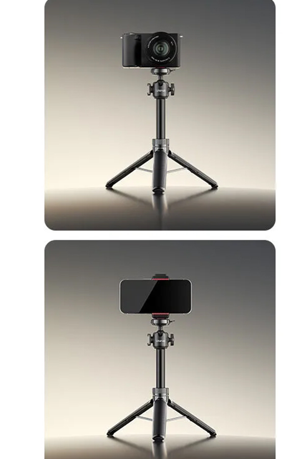 - ความเอนกประสงค์ 2-in-1: ใช้เป็นขาตั้งกล้องเต็มรูปแบบ ความสูง 21.5-62 ซม. เปลี่ยนเป็นไม้เซลฟี่ได้ทันที สำหรับการถ่ายเซลฟี่และกรุ๊ปโฟโต้ โหมด Livestreaming เหมาะสำหรับการสตรีมและวิดีโอคอล รองรับการถ่ายภาพ Vlog และ Travel Photography