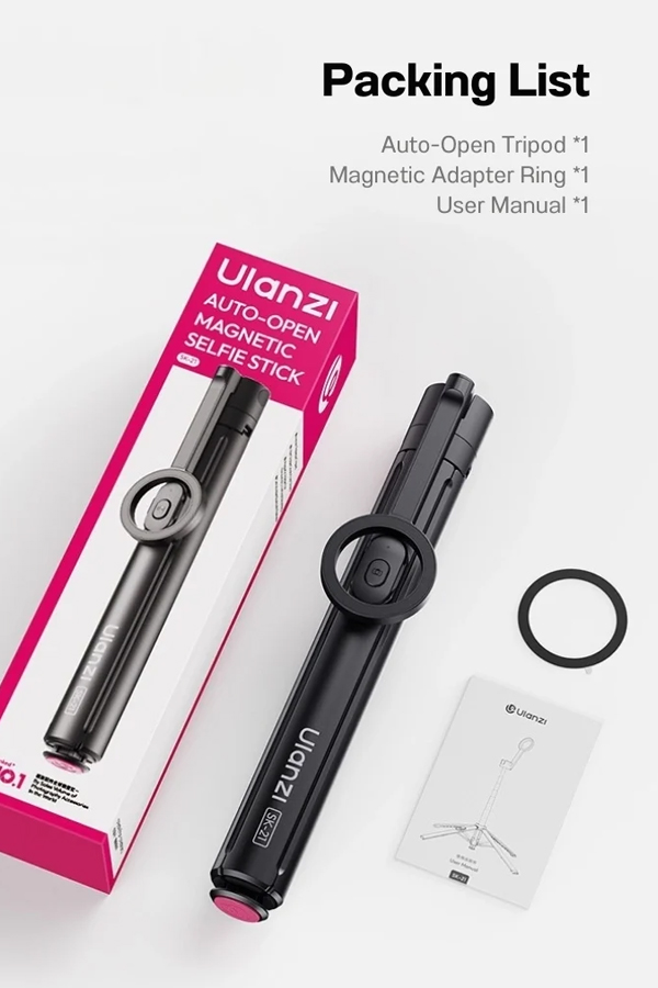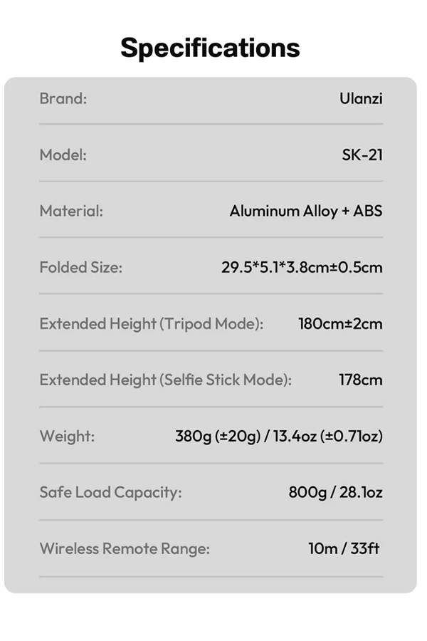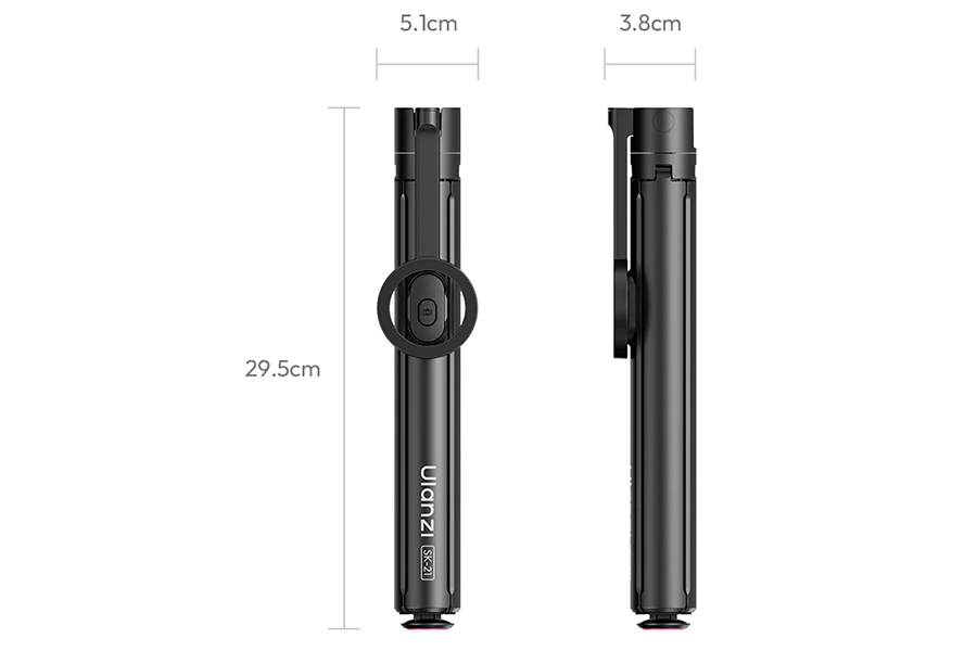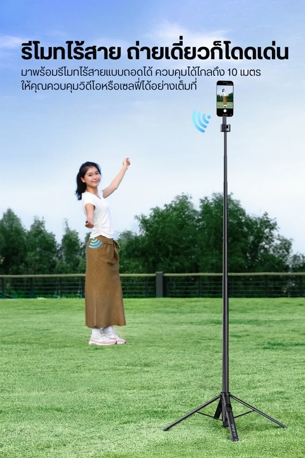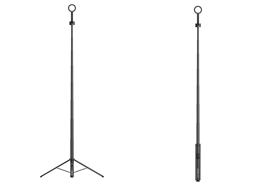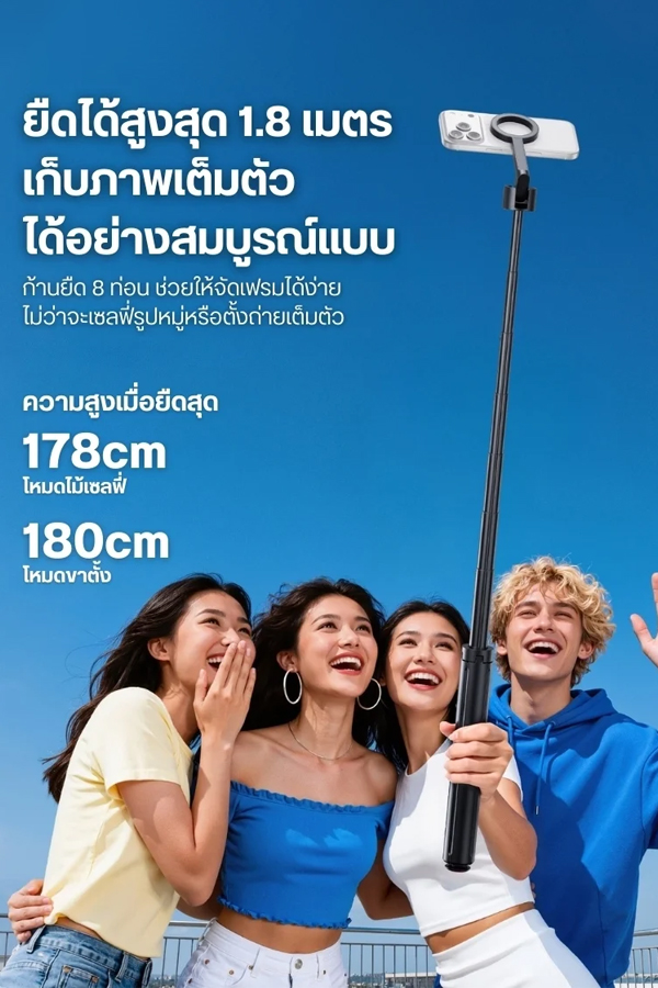 - สูงได้ถึง 1.8 เมตร – ก้านยืด 8 ท่อน รองรับทั้งโหมดไม้เซลฟี่ (178 ซม.) และขาตั้งพื้น (180 ซม.)