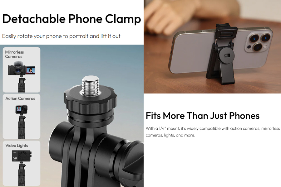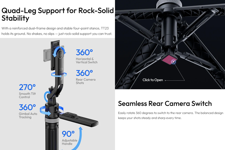 ความเสถียรและความยืดหยุ่น: Quad-Leg Support ขาตั้งสี่จุด มั่นคงกว่าขาทั่วๆ ไป Flexible Ball Head หมุนได้ 360° ทุกทิศทาง Adjustable Gimbal ปรับองศาได้สำหรับท่านั่งและยืน Lock Button สำหรับล็อคการหมุนในโหมด Handheld