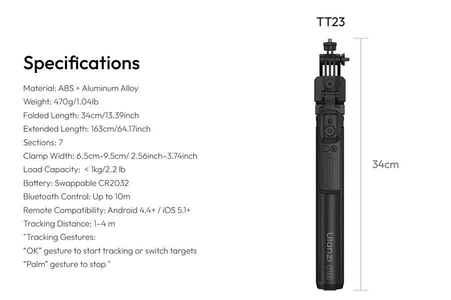การออกแบบอเนกประสงค์: ยืดความยาวได้ 34-163cm เหมาะกับทุกการใช้งาน Detachable Phone Clamp ถอดออกได้ง่าย Seamless Rear Camera Switch เปลี่ยนกล้องหลังได้ราบรื่น Creative Modes หลากหลายโหมดการถ่าย