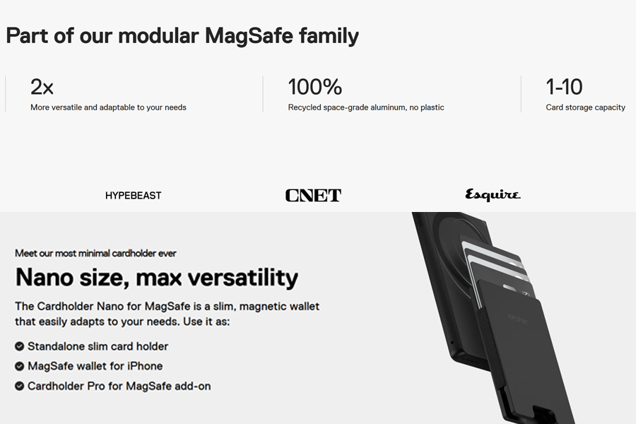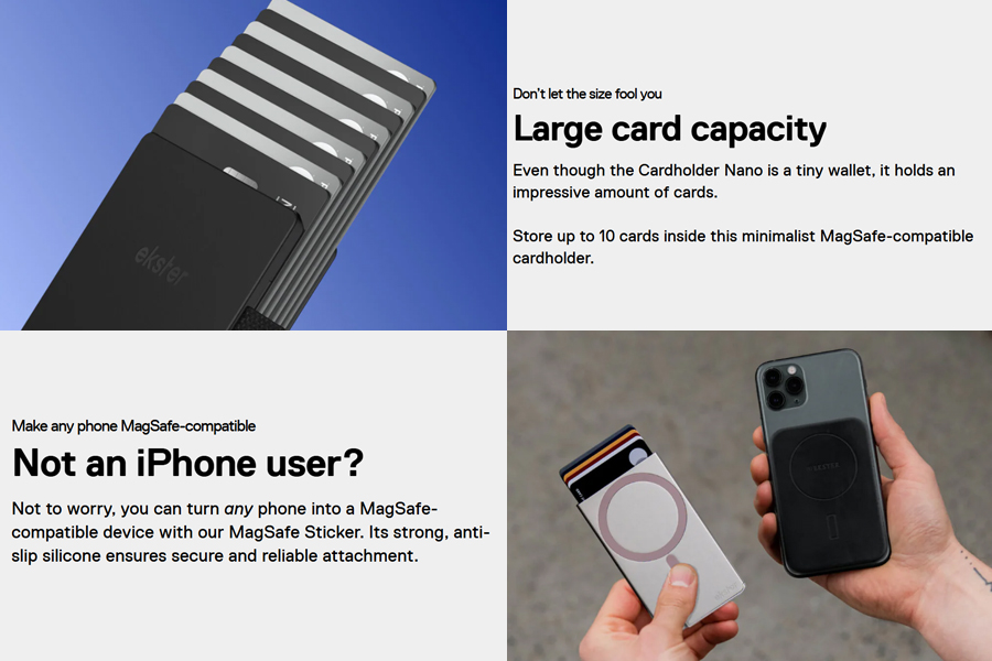 EKSTER - Cardholder Nano for MagSafe คือที่ใส่บัตรขนาดเล็กที่สุดของเรา ใช้งานได้ทั้งแบบเดี่ยวๆ ใช้เป็นที่ใส่บัตร MagSafe ติดหลังมือถือ หรือใช้เป็นอุปกรณ์เสริมสำหรับ Cardholder Pro for MagSafe เพิ่มความจุในการใส่บัตร