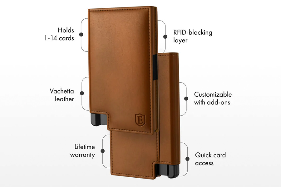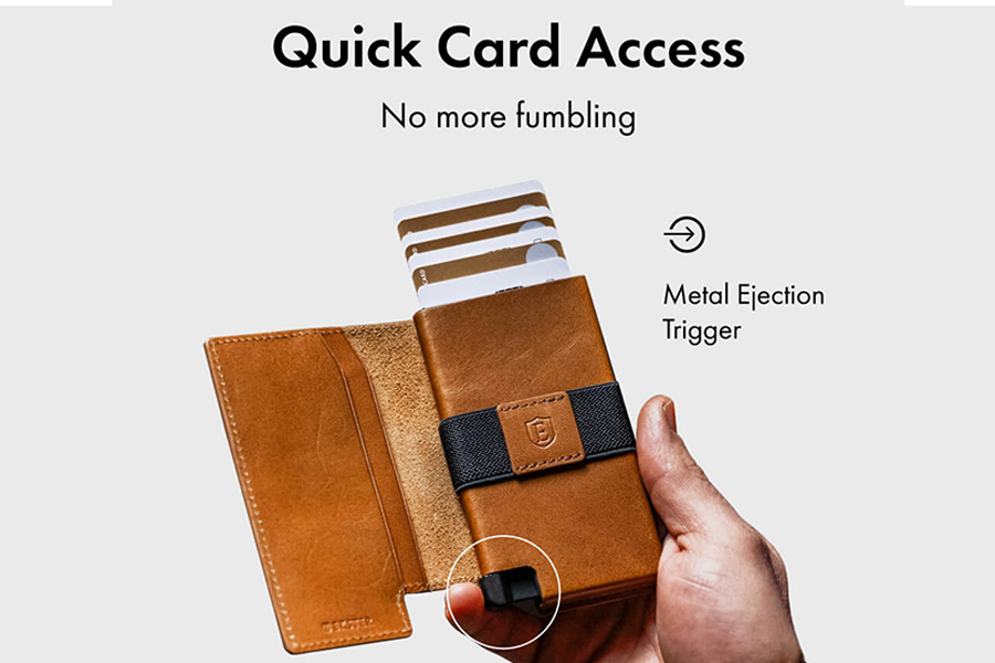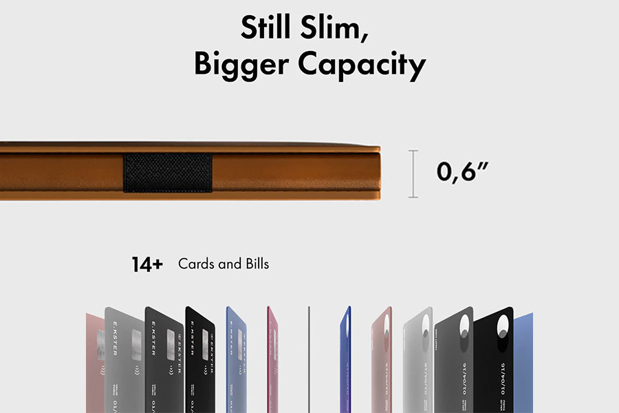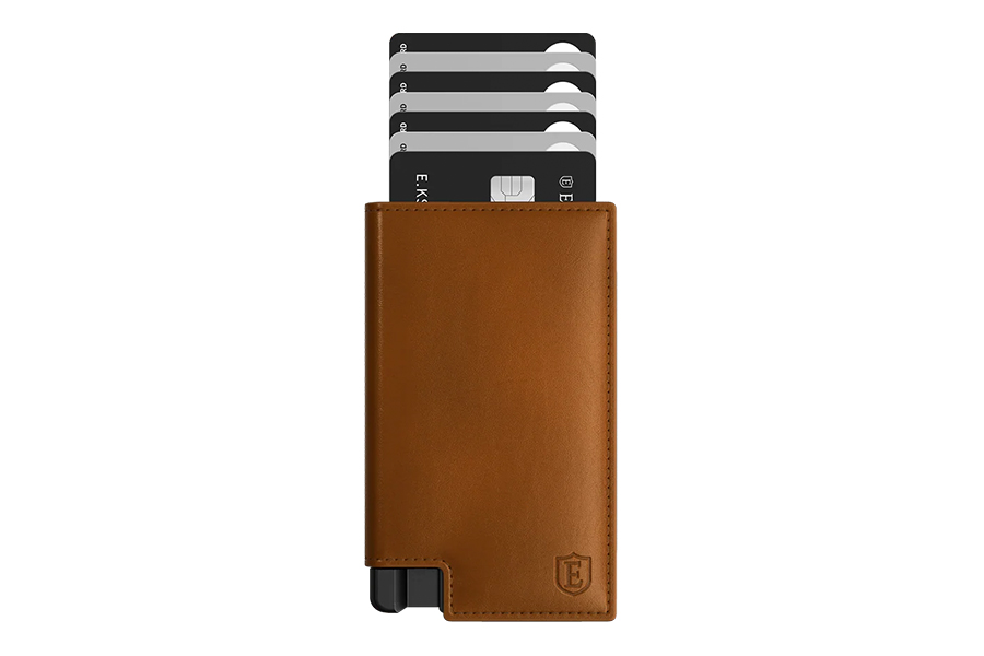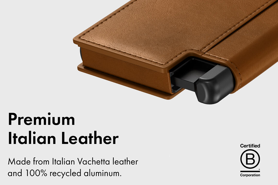 Ekster - Wallet Pro กระเป๋าสตางค์หนังสุดสมาร์ทที่บางที่สุด ผลิตจากอะลูมิเนียมรีไซเคิล 100% และหนัง Vachetta อิตาลีสุดหรู ออกแบบให้มีช่องเก็บที่เพรียวบาง เปิดหยิบบัตรได้รวดเร็วเพียงกดปุ่ม