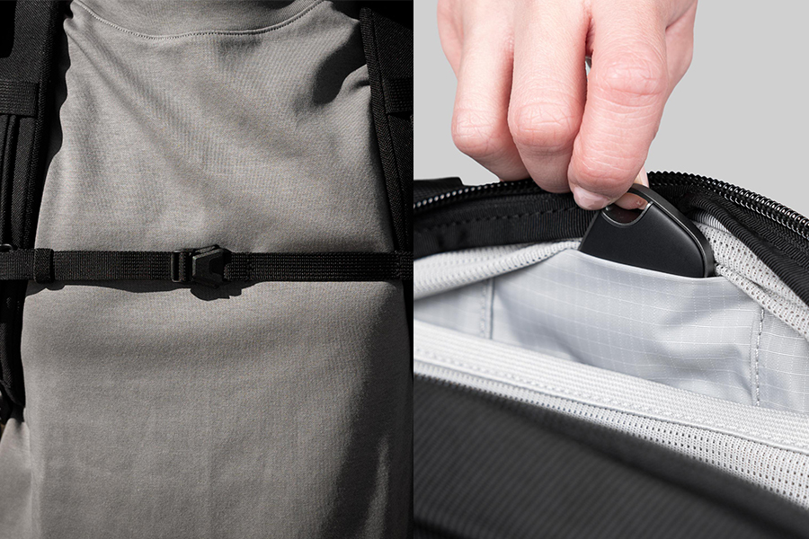 - วัสดุ : Exterior: 840D 100% Nylon // Lining: 150D PFAS-free PU Coated Ripstop Nylon Lining // Hardware:#10 & #8 YKK RC Zippers with DWR (Durable Water Repellent) Finish #5 YKK RC Zippers // Woojin Buckles // WETOOL Aluminum Key Clip