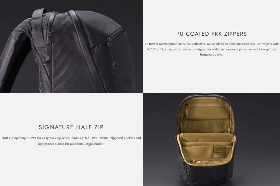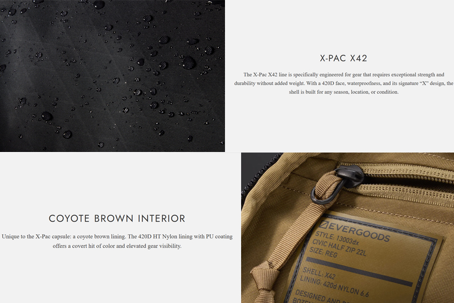 - วัสดุ : Shell Textile Black X-Pac X42 // Lining Fabric Coyote Brown 420d HT nylon with PU coating // Shoulder pad foam: Zote EV50 // Frame Sheet: HDPE // Zippers: #10 and #8 YKK Pu Coated RC Coil Sliders