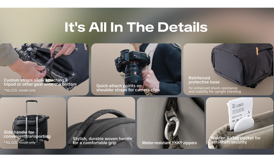 พกพาสิ่งของจำเป็นสำหรับการเดินทางหรือการใช้งานในชีวิตประจำวันของคุณไปกับกระเป๋าเป้สะพายหลัง PGYTECH - OneGo Lite Backpack 12L กระเป๋าเป้น้ำหนักเบานี้ออกแบบมาเพื่อใส่กล้อง DSLR หรือกล้องมิเรอร์เลสมาตรฐานของคุณ พร้อมเลนส์หรืออุปกรณ์เสริมสำหรับการถ่ายภาพได้มากถึงสามชิ้นในช่องด้านล่าง ช่องพร้อมตัวล็อคแม่เหล็กสำหรับเก็บแล็ปท็อปขนาด 14 นิ้วหรือแท็บเล็ตของคุณ OneGo Lite Backpack 12L มีการเปิดด้านหลังได้เต็มที่ 180°เพื่อความสะดวกในการใส่และนำสิ่งของออกใช้งาน พกพาได้ทั้งขาตั้งกล้องหรือขวดน้ำในช่องด้านข้างที่จัดไว้ให้ และยังสามารถติดขาตั้งกล้องหรือสิ่งของขนาดใหญ่ชิ้นอื่น ๆ ไว้ที่ด้านล่างโดยใช้สายรัดอุปกรณ์เสริมที่ให้มาด้วย