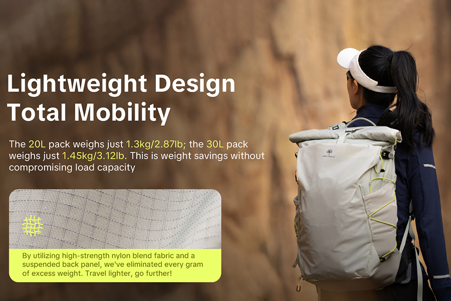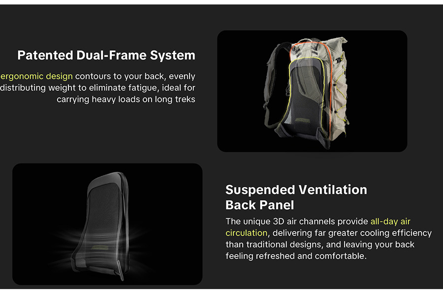 - ผ้า Nylon Blend ความแข็งแรงสูง ผสานโครงสร้างแผ่นหลังแบบแขวน (Suspended Back Panel) ช่วยลดน้ำหนักส่วนเกิน