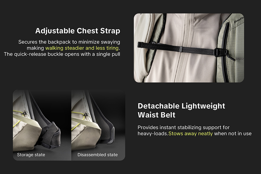 PGYTECH - OnePro Ultralight Backpack มาพร้อมสะพายระดับมืออาชีพ AirFoam Suspension System เสริมโครงโลหะภายใน ช่วยกระจายน้ำ หนักไปทั่วแผ่นหลังได้อย่างมีประสิทธิภาพ ลดแรงกดทับ ระหว่างการใช้งานเป็นเวลานาน แผ่นหลังแบบ Mesh ระบายอากาศได้ดี เพิ่มความโปร่งสบายตลอดการเดินทาง สายสะพายไหล่แบบกว้าง บุฟองน้ำหนานุ่ม พร้อมสายรัดหน้าอกที่สามารถปรับได้ ช่วยลดแรงกดบนหัวไหล่อย่างเห็นได้ชัด อีกทั้งสายสะพายยังมีช่องเก็บโทรศัพท์หรืออุปกรณ์ชิ้นเล็ก เพิ่มความสะดวกในการใช้งาน