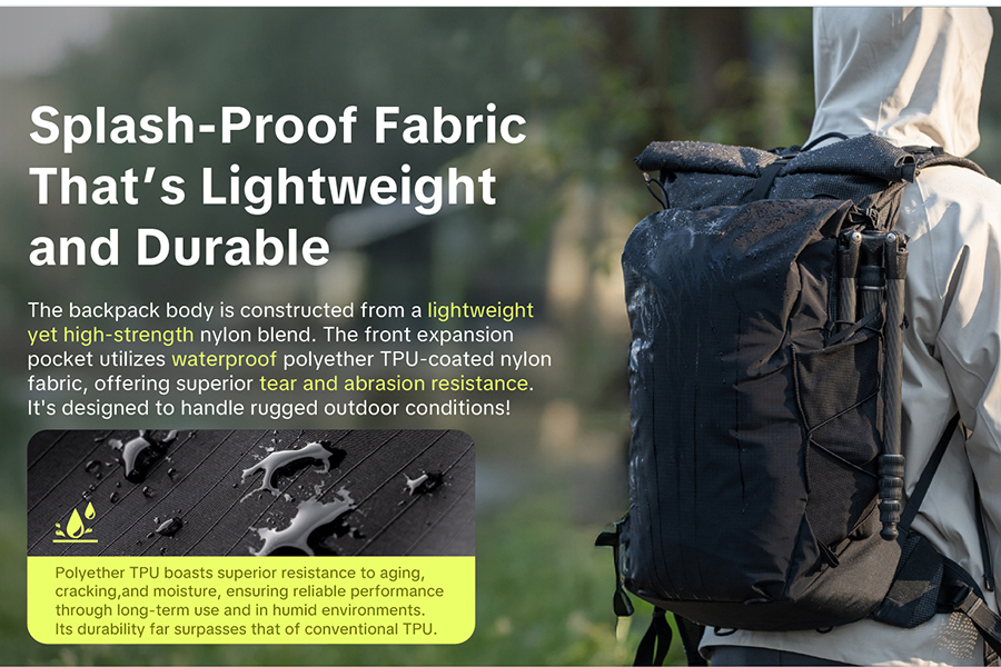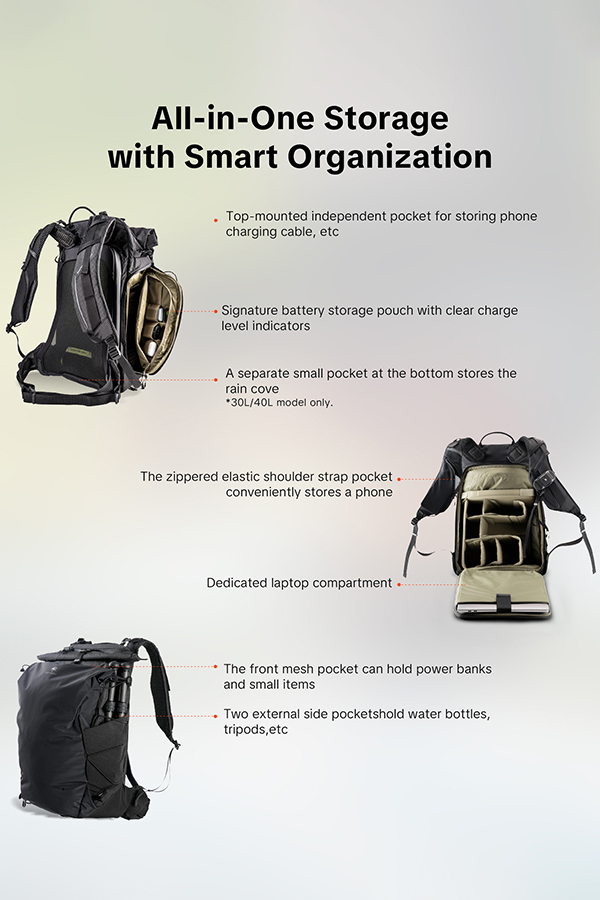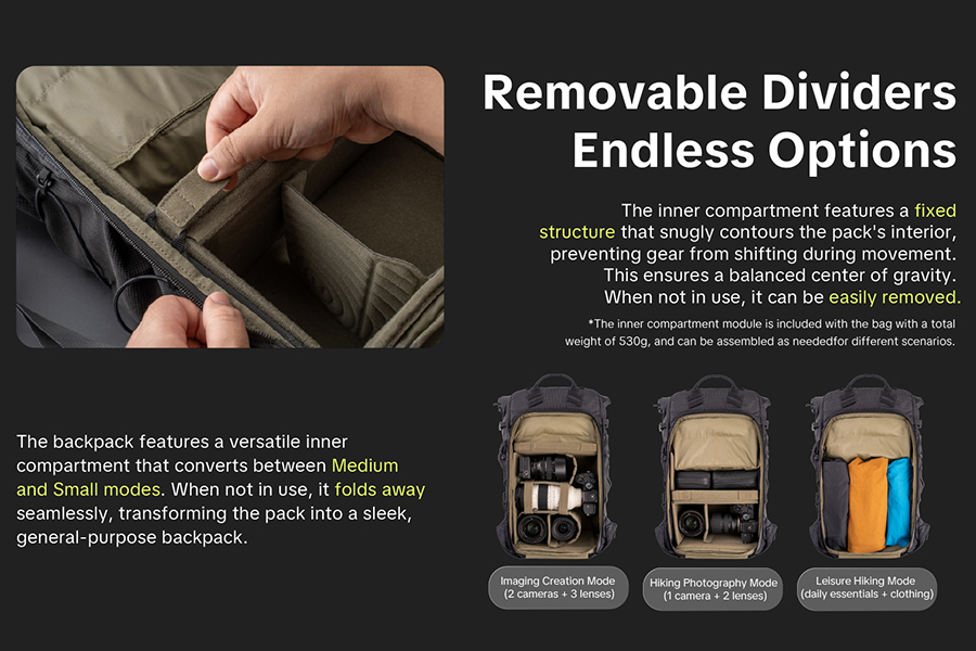 ตัวกระเป๋าผลิตจากผ้า Nylon Blend ความแข็งแรงสูง ผสานโครงสร้างแผ่นหลังแบบแขวน (Suspended Back Panel) ช่วยลดน้ำหนักส่วนเกินให้เบาที่สุด โดยยังคงความแข็งแรงและรองรับน้ำหนักได้อย่างมั่นใจ หนึ่งในจุดเด่นสำคัญคือ ช่องหยิบกล้องด้านข้างแบบ Quick Access ที่ช่วยให้สามารถหยิบกล้อง ได้อย่างรวดเร็วโดยไม่ต้องถอดกระเป๋า แตกต่างจากกระเป๋ากล้องน้ำหนักเบาทั่วไป