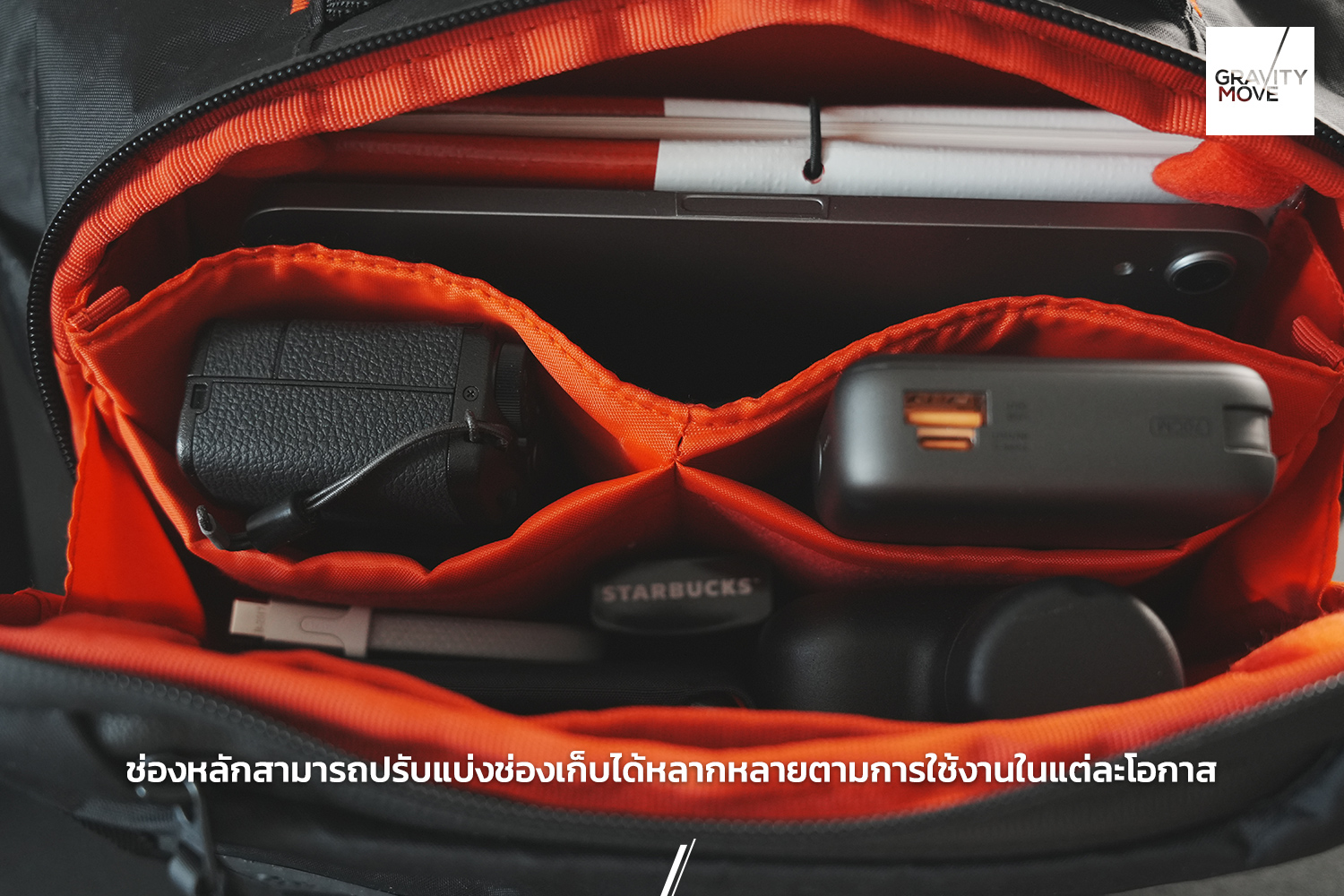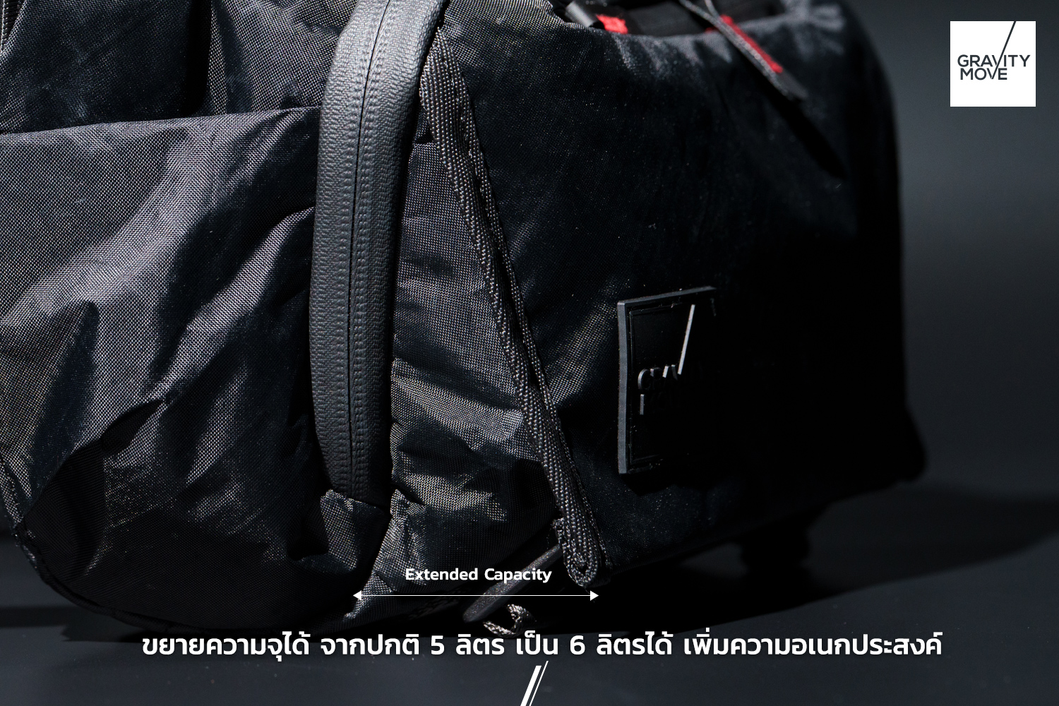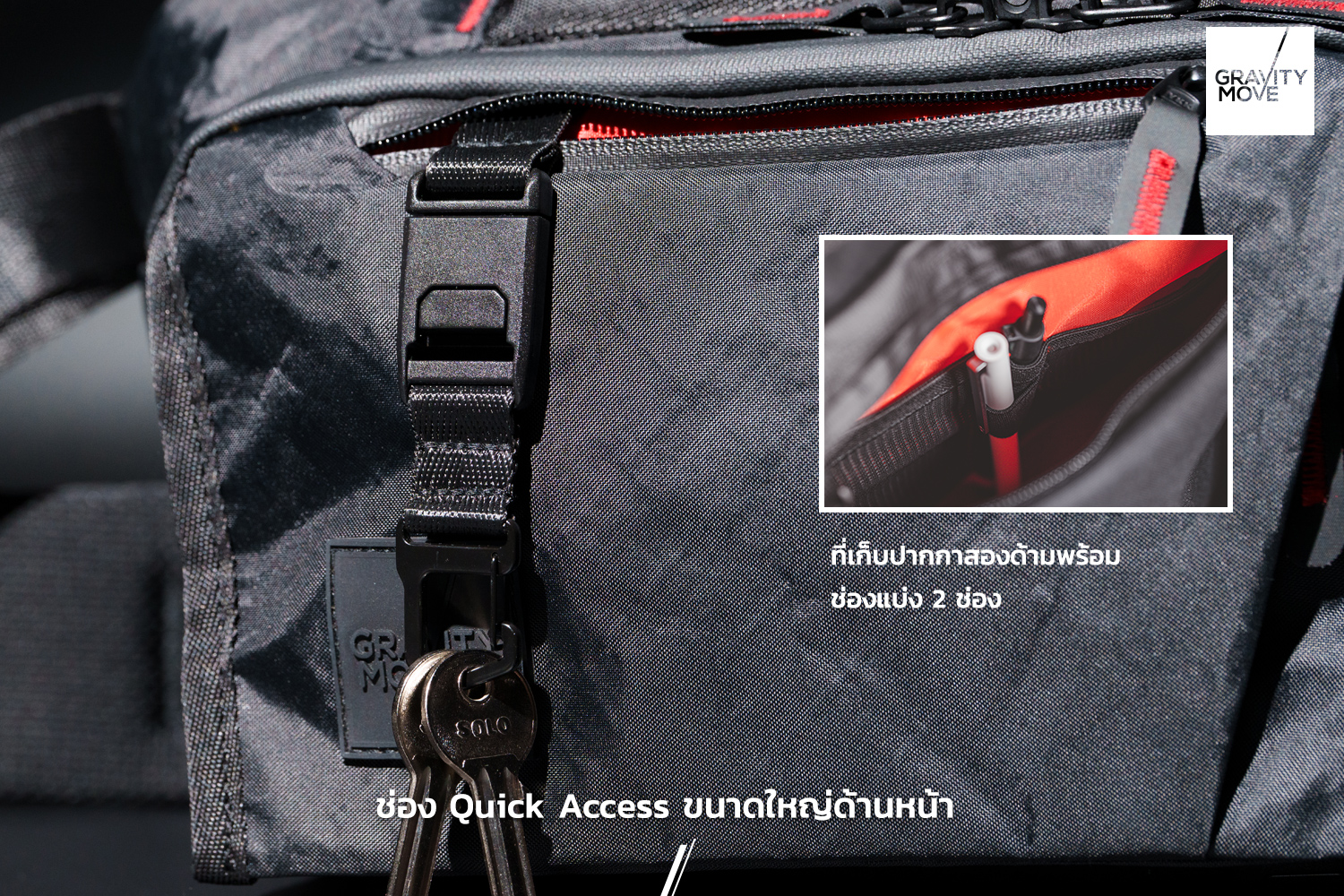 ในด้านรูปลักษณ์ ถูกปรับให้เรียบคลีนขึ้นมากๆ เพื่อให้เหมาะกับการใช้งานที่หลากหลายยิ่งขึ้น แต่ก็ยังคง DNA ของแบรนด์ด้วยเส้นเฉียงที่ด้านหน้า ในด้านของวัสดุ นี่คือครั้งแรก ที่ Gravity Move ใช้ผ้าภายนอกจาก ECOPAK แบรนด์ผ้าอเมริกาที่มาแรงสุดๆ ในปัจจุบัน ผ้าที่เลือกมาคือ ECOPAK EPLX200 Black Knight ผ้า Laminated 3 layers กันน้ำ น้ำหนักเบา ผิวสัมผัสพรีเมี่ยม พร้อมฟังก์ชั่นเด็ดๆ Buckle Strap คือ Fidlock V buckle จากเยอรมัน เป็น Buckle ที่โด่งดังและสร้างมาตรฐานใหม่ให้กับวงการ buckle ในปัจจุบัน ด้านในกระเป๋าออกแบบให้สามารถปรับช่องใส่ได้หลากหลาย ตามอุปกรณ์ที่พกพา จะใช้กล้อง หรือไม่ใช้กล้อง คุณสามารถจัดได้อย่างสมบูรณ์ที่สุด ฝากระเป๋ามาพร้อมระบบปิดชั่วคราวด้วยแม่เหล็ก ช่วยให้คุณสามารถปิดกระเป๋าชั่วคราวได้อย่างรวดเร็ว ขนาดเล็กลง แต่ยังจุได้ถึง 5 ลิตร พร้อมขยายเป็น 6 ลิตรได้ ช่อง Quick Access ด้านหน้า ขนาดใหญ่ เก็บมือถือสะดวก ซิป YKK Aquaguard กันน้ำ พร้อม Hook ล็อค กันคนแอบเปิด ช่องซิปด้านหลังแนบตัว กันขโมย ช่องเก็บของ 19 ช่อง สายสะพายพร้อม Pad บุนุ่ม ยาวพิเศษ รองรับทุกองศาการสะพาย ปรับสายให้สั้น เพื่อใช้คาดเอวได้ มีสายรัดอเนกประสงค์ด้านล่าง มือจับบุนุ่ม แบบ Low Profile น้ำหนักเบาเพียง 600 กรัม