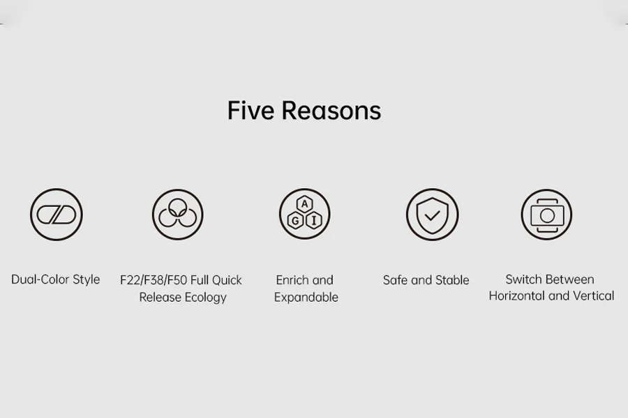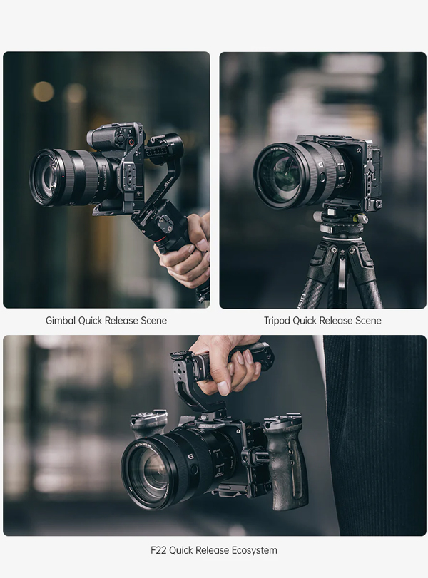 ระบบ Quick Release แบบครบวงจร F22/F38/F50: รองรับระบบ FALCAM Quick Release Ecosystem อย่างสมบูรณ์ อินเทอร์เฟซ F22, F38 และ F50 ครบทุกขนาด เปลี่ยนระหว่าง Gimbal, Tripod และ Slider ได้อย่างรวดเร็ว Quick Release Scene พร้อมใช้งานทั้งกับ Gimbal และ Tripod สลับระหว่างแนวนอนและแนวตั้งได้ทันทีด้วย F38 Quick-Release Mounts