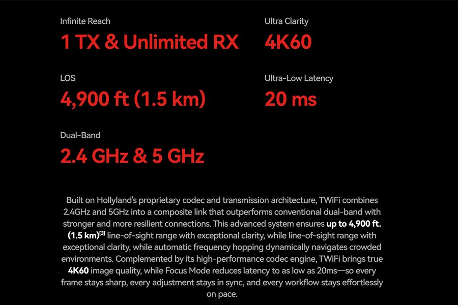 Broadcast Mode: Unlimited (Up to 20 RXs for Optimal Performance) Signal Stability Auto Frequency Hopping (< 1s)