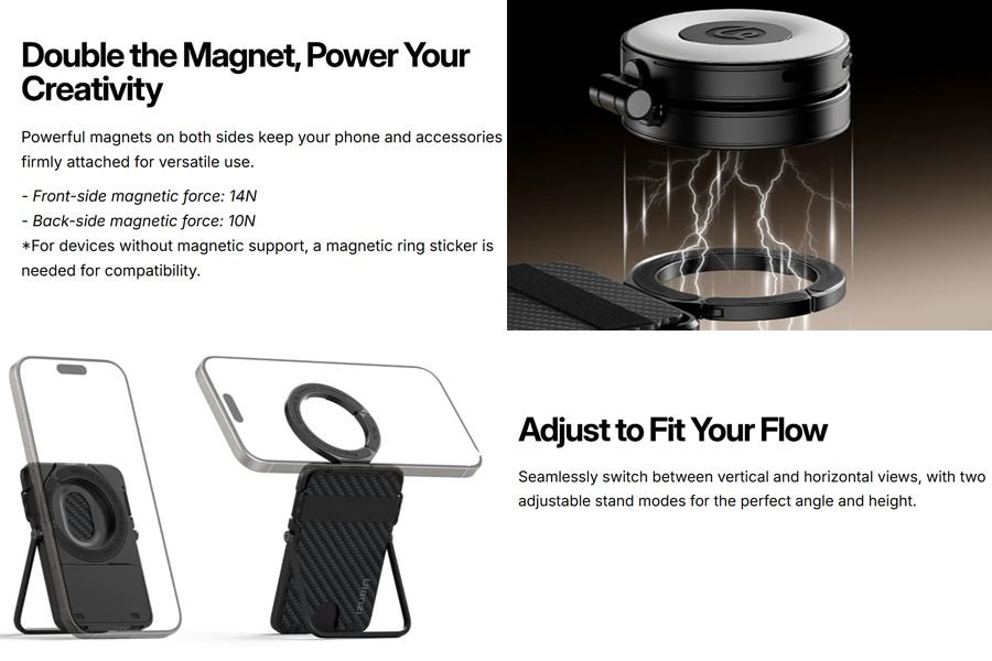 ระบบแม่เหล็กสองด้านแรงสูง: แม่เหล็กด้านหน้าแรง 14N ยึดเกาะมือถือแน่นสนิท แม่เหล็กด้านหลัง 10N ติดอุปกรณ์เสริมได้หลากหลาย รองรับมือถือ MagSafe ทุกรุ่น iPhone 12 ขึ้นไป มาพร้อม Magnetic Ring Sticker สำหรับมือถือที่ไม่มี MagSafe