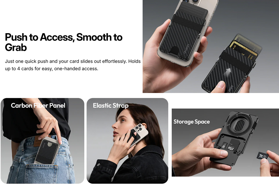 จัดเก็บอัจฉริยะ เข้าถึงง่าย: เก็บบัตรได้สูงสุด 4 ใบ พร้อมระบบกดออกแบบ Push-to-Access แผงคาร์บอนไฟเบอร์กันบัตรงอ แข็งแรงทนทาน สายรัดยางยืดล็อคบัตรให้ปลอดภัย ช่องเก็บ SIM Pin, SD Card และ TF Card ในตัว