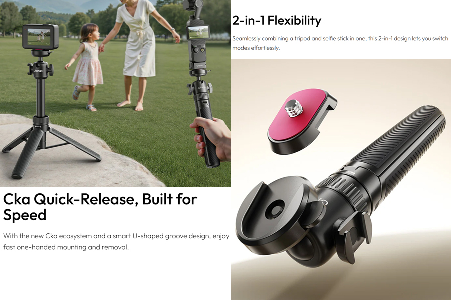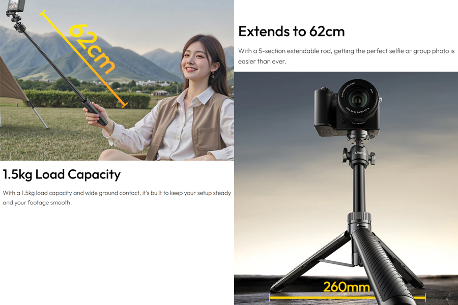 - ความเอนกประสงค์ 2-in-1: ใช้เป็นขาตั้งกล้องเต็มรูปแบบ ความสูง 21.5-62 ซม. เปลี่ยนเป็นไม้เซลฟี่ได้ทันที สำหรับการถ่ายเซลฟี่และกรุ๊ปโฟโต้ โหมด Livestreaming เหมาะสำหรับการสตรีมและวิดีโอคอล รองรับการถ่ายภาพ Vlog และ Travel Photography