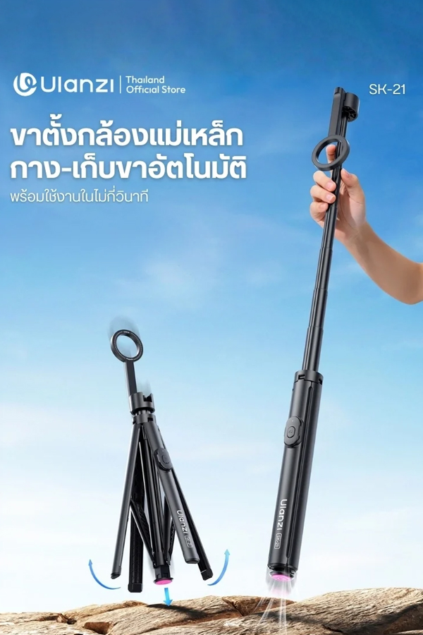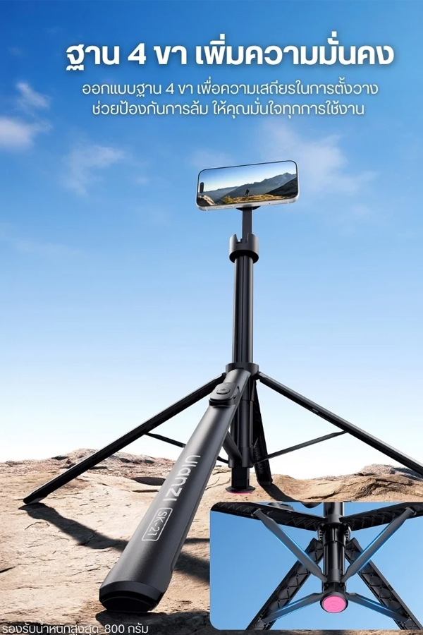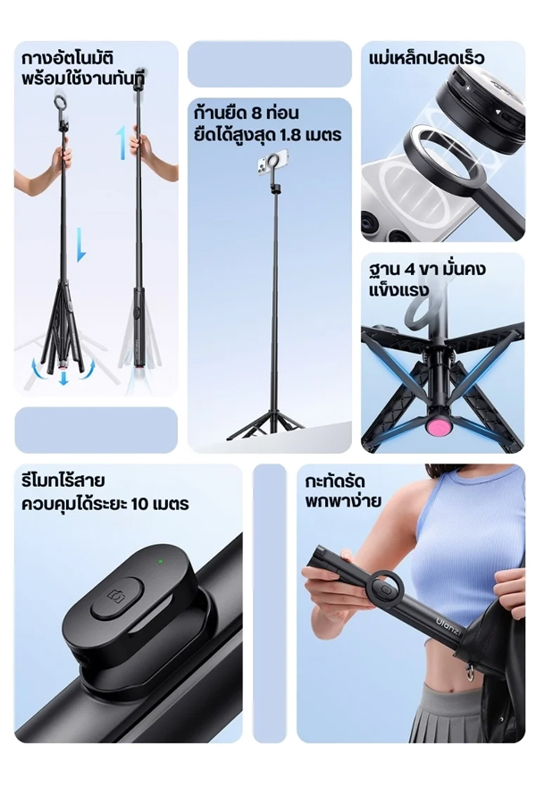 - สูงได้ถึง 1.8 เมตร – ก้านยืด 8 ท่อน รองรับทั้งโหมดไม้เซลฟี่ (178 ซม.) และขาตั้งพื้น (180 ซม.)