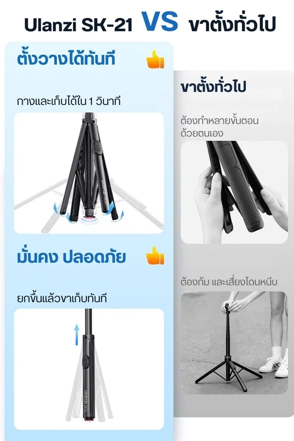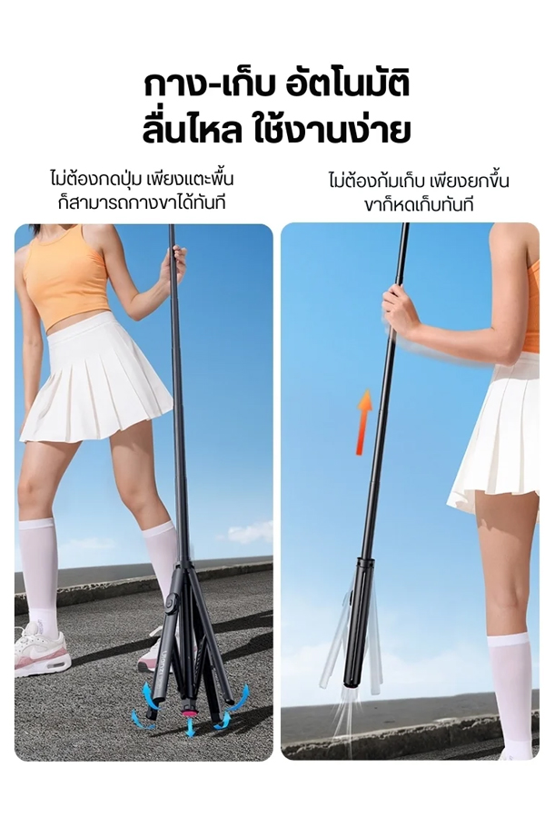 - กางขาอัตโนมัติใน 1 วินาที – แตะพื้นก็กาง ยกขึ้นก็เก็บ ไม่ต้องกดปุ่มหรือไขสกรูใดๆ