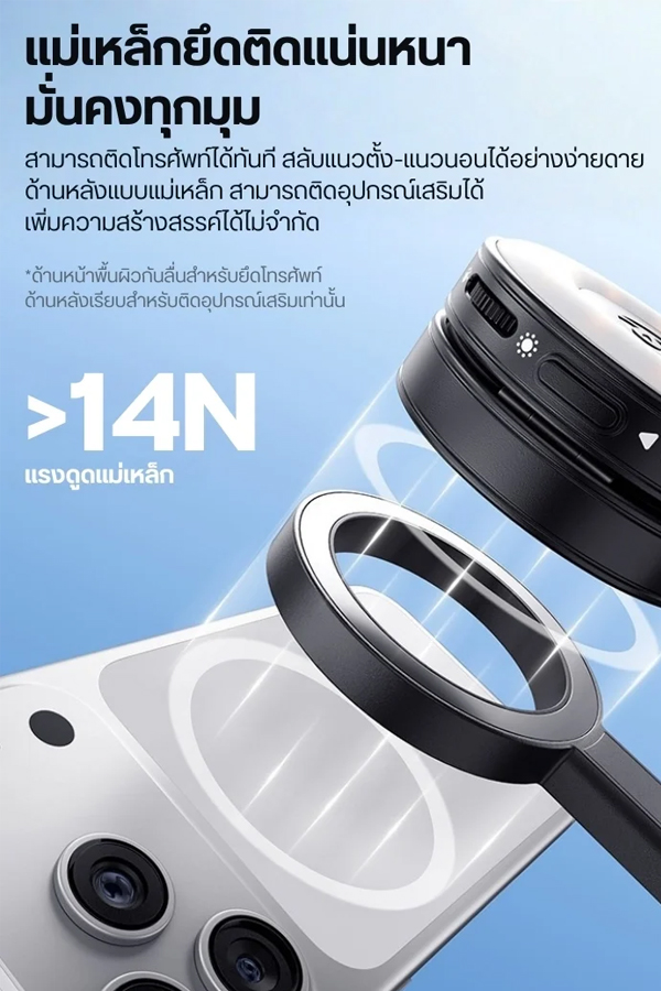 - หัวแม่เหล็ก 2 ด้าน – ด้านหน้าติดมือถือได้ทันที ด้านหลังติดอุปกรณ์เสริม เพิ่มความยืดหยุ่นในการ Setup