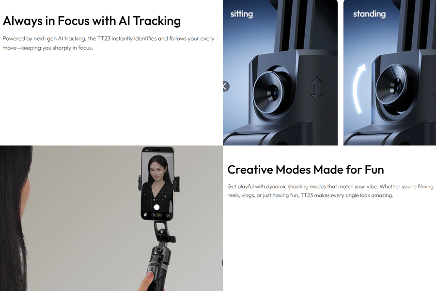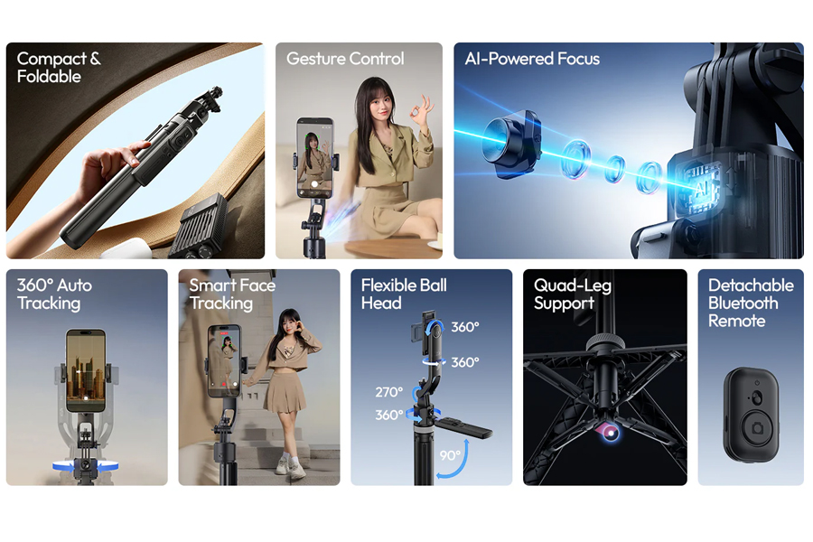 เทคโนโลยี AI Auto-Tracking ล้ำสมัย: ระบบติดตาม 360° แบบอัตโนมัติ ไม่พลาดทุกการเคลื่อนไหว Smart Face Tracking ติดตามใบหน้าอย่างแม่นยำ Smart Body Tracking และ Back-view Tracking ระยะการติดตาม 1-4 เมตร ให้ความยืดหยุ่นในการใช้งาน