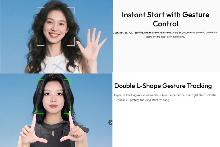 การควบคุมด้วยท่าทางอัจฉริยะ: Gesture Control ด้วยท่าทาง “OK” เพื่อเริ่มติดตามหรือเปลี่ยนเป้าหมาย หยุดการติดตามได้ด้วยการยกมือ ไม่ต้องใช้รีโมทควบคุม เพียงแค่โบกมือ ติดตามได้แม้ในสถานการณ์ที่มีสิ่งกีดขวาง