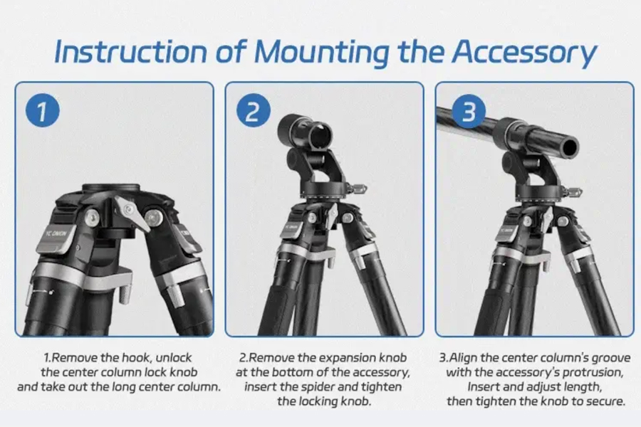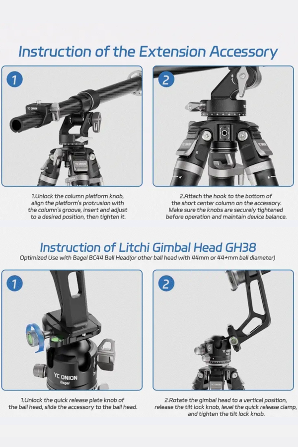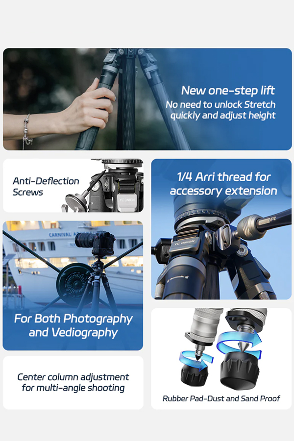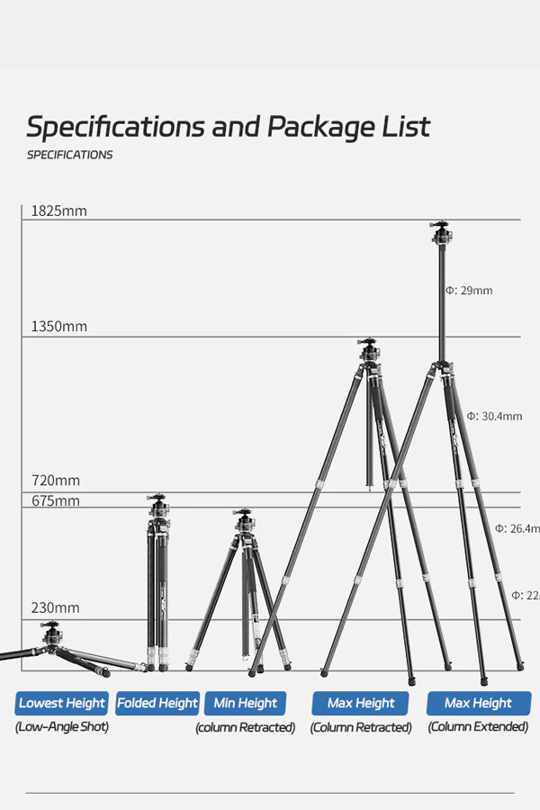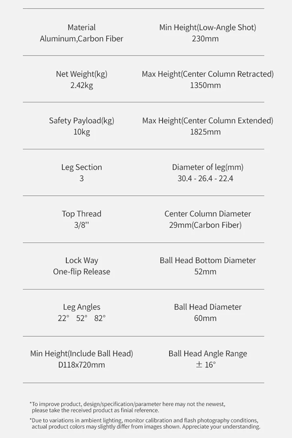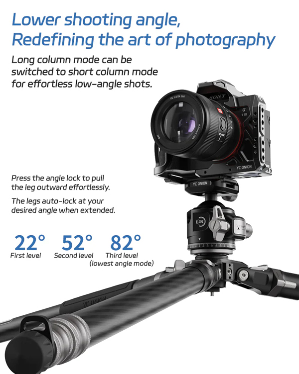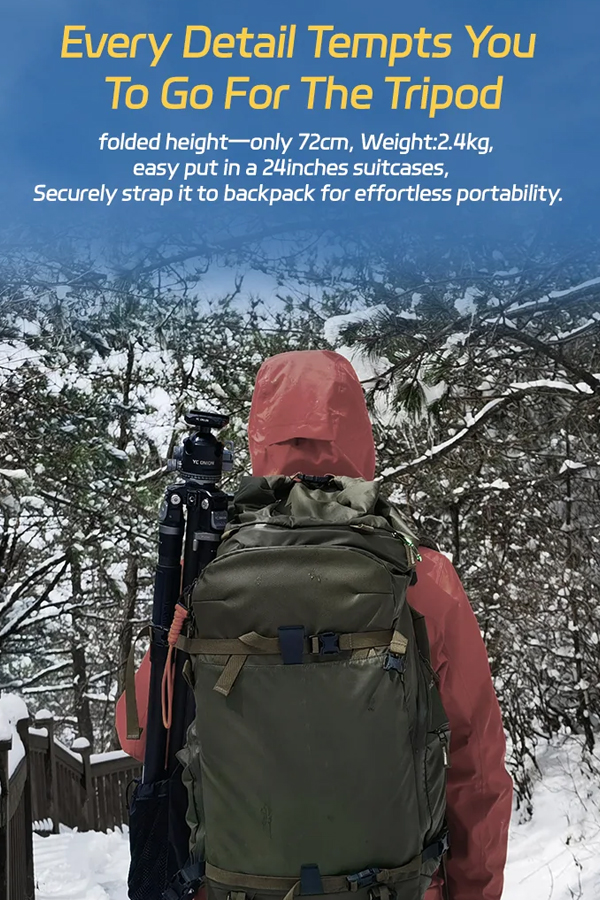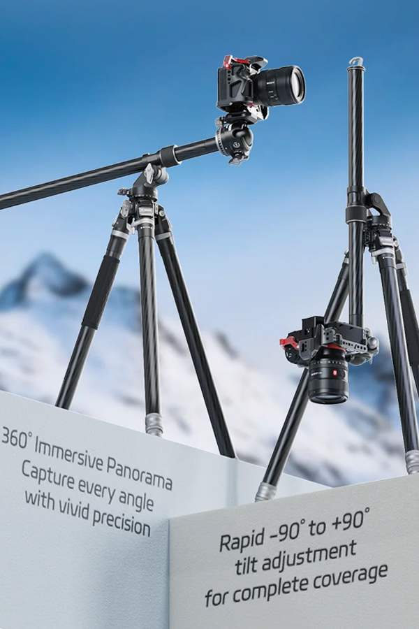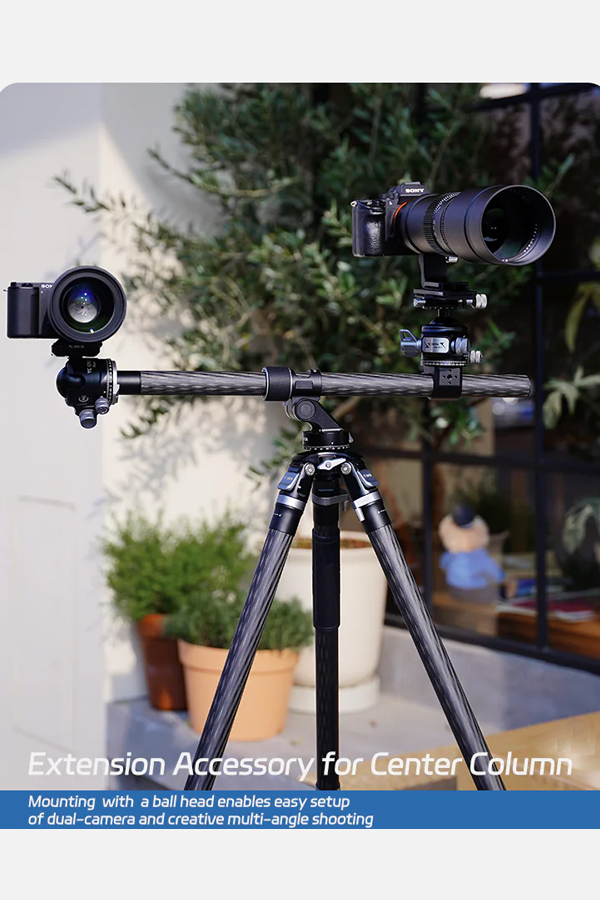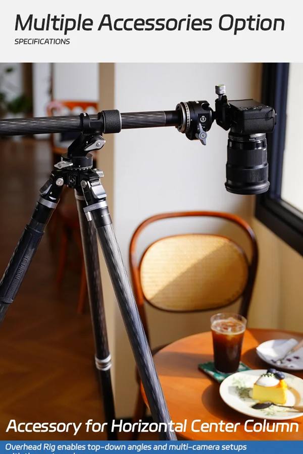 ขาตั้งกล้องพร้อมหัวเหมาะสำหรับถ่ายมุม Top-down, ถ่ายอาหาร หรือการตั้งหลายกล้องพร้อมกัน ปรับหมุนแพน/เอียงได้อิสระ ครอบคลุมทุกองศา น้ำหนักเพียง 2.2 กก. พับเก็บได้สั้นสุดเพียง 64 ซม.ใส่กระเป๋าเดินทาง 24 นิ้วได้พอดี หรือสะพายติดเป้ได้ง่าย เหมาะสำหรับทั้งช่างภาพมืออาชีพและสายท่องเที่ยวที่ต้องการอุปกรณ์น้ำหนักเบา แต่ใช้งานได้ครอบคลุมทั้งงานถ่ายภาพทั่วไป, พาโนรามา, มาโคร และวิดีโอในทุกสภาพพื้นผิว